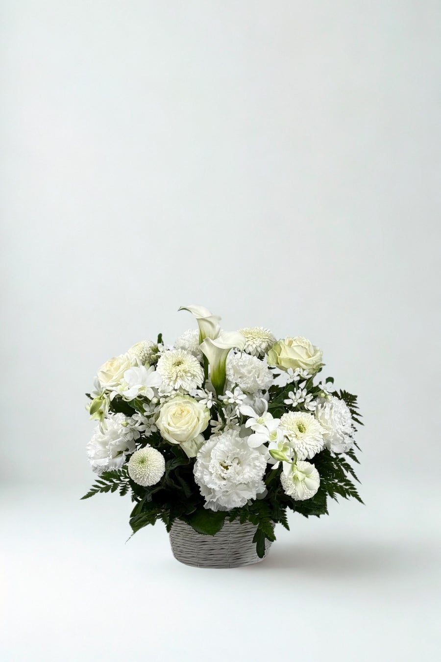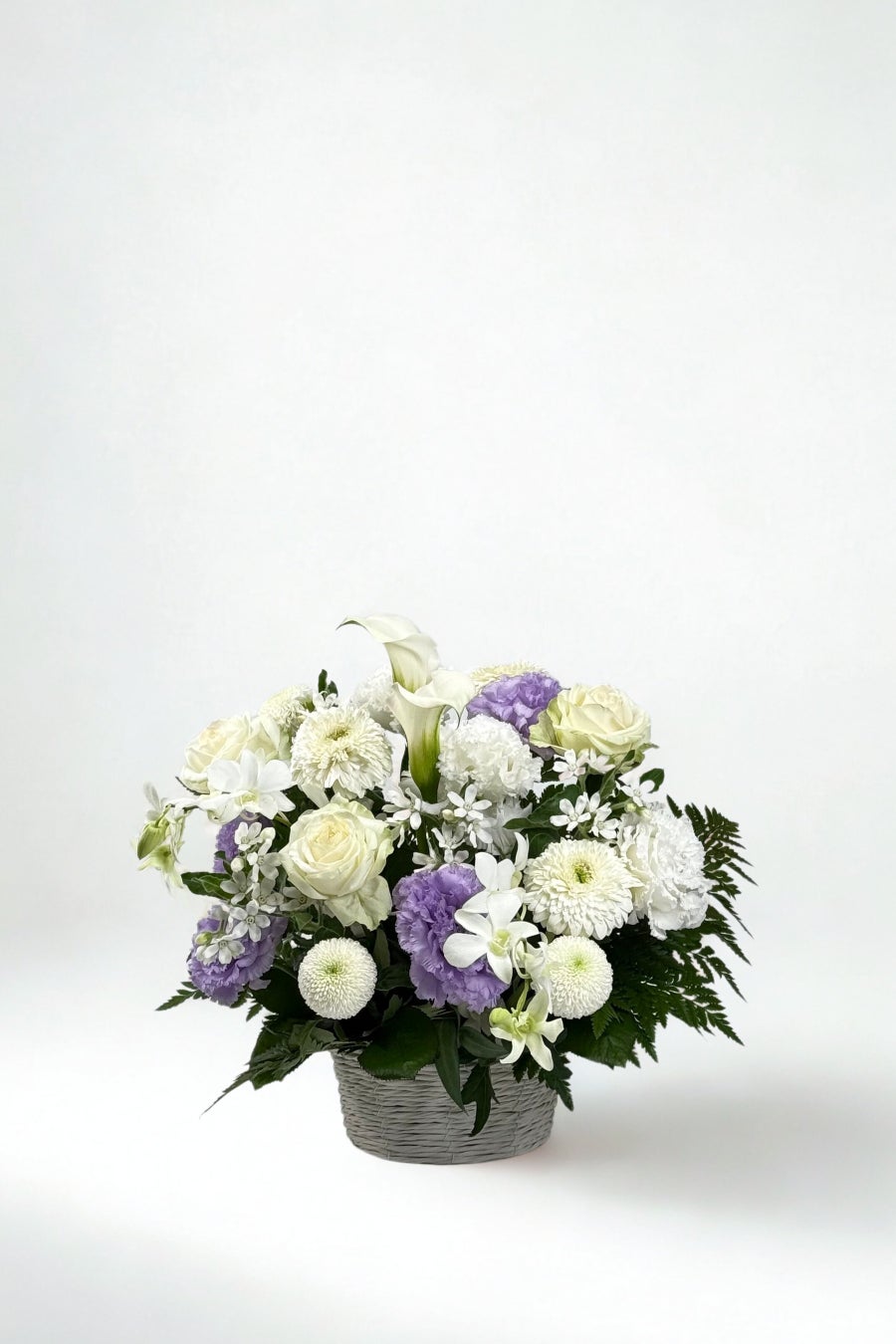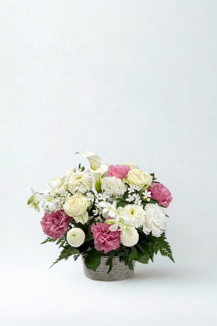 やさしい彩りと柔らかなフォルムが特徴のスモールサイズのアレンジメント。ご自宅での手を合わせるひとときに寄り添う、上品でコンパクトな仕上がりです。贈り物としても気持ちが伝わるサイズ感です。