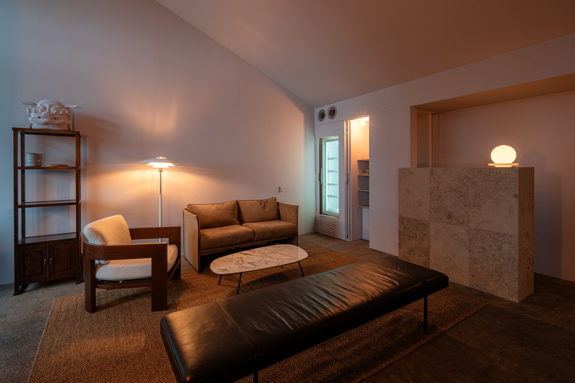 体が包み込まれるような心地よいソファに身をゆだね、光の移ろいとともに、時間帯によって変わる空間の表情をお楽しみください。