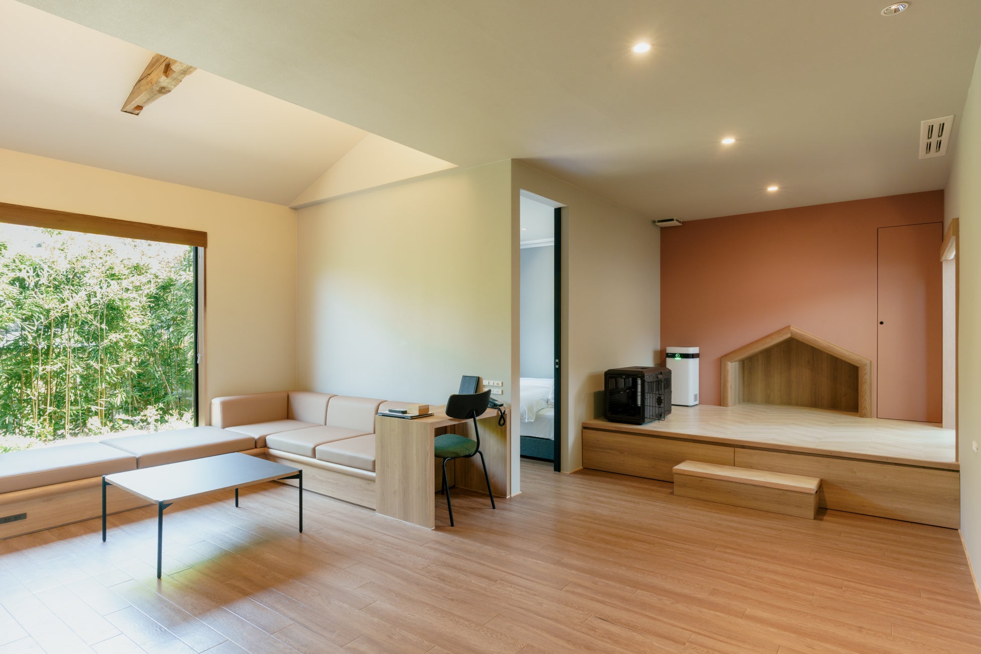 館内には、自由にご利用いただけるラウンジ機能を備えております。 コーヒーや山口名産の夏みかんジュースなど、ソフトドリンクを自由にお楽しみいただけるほか、 チェックイン後のひと休みや、食後の語らいなど、それぞれの時間に合わせて、 愛犬とともに穏やかなひとときをお過ごしいただけます。