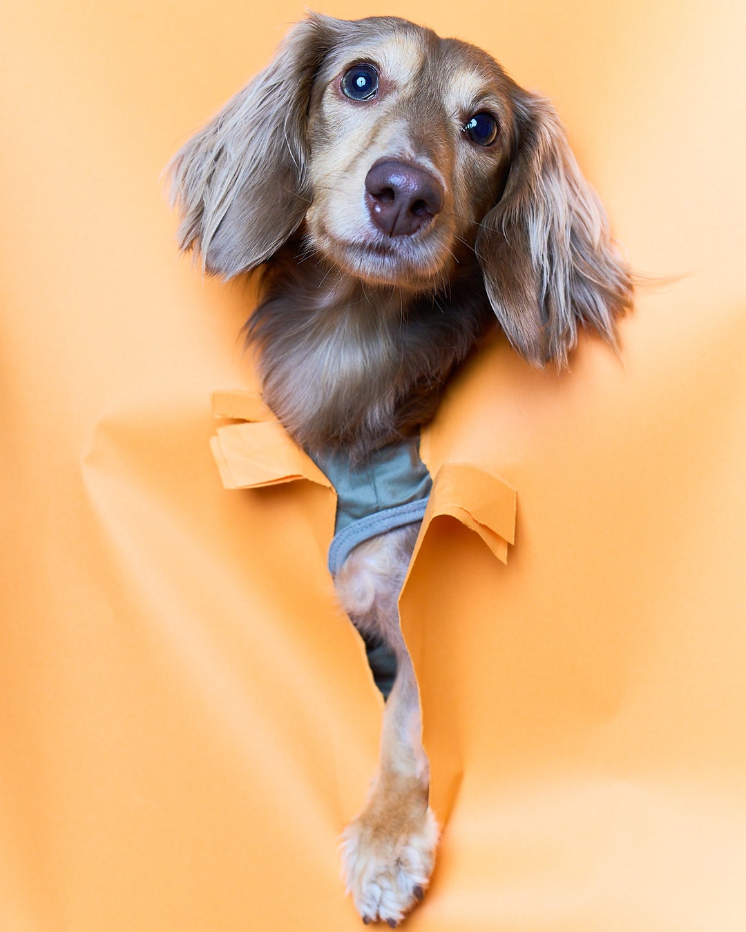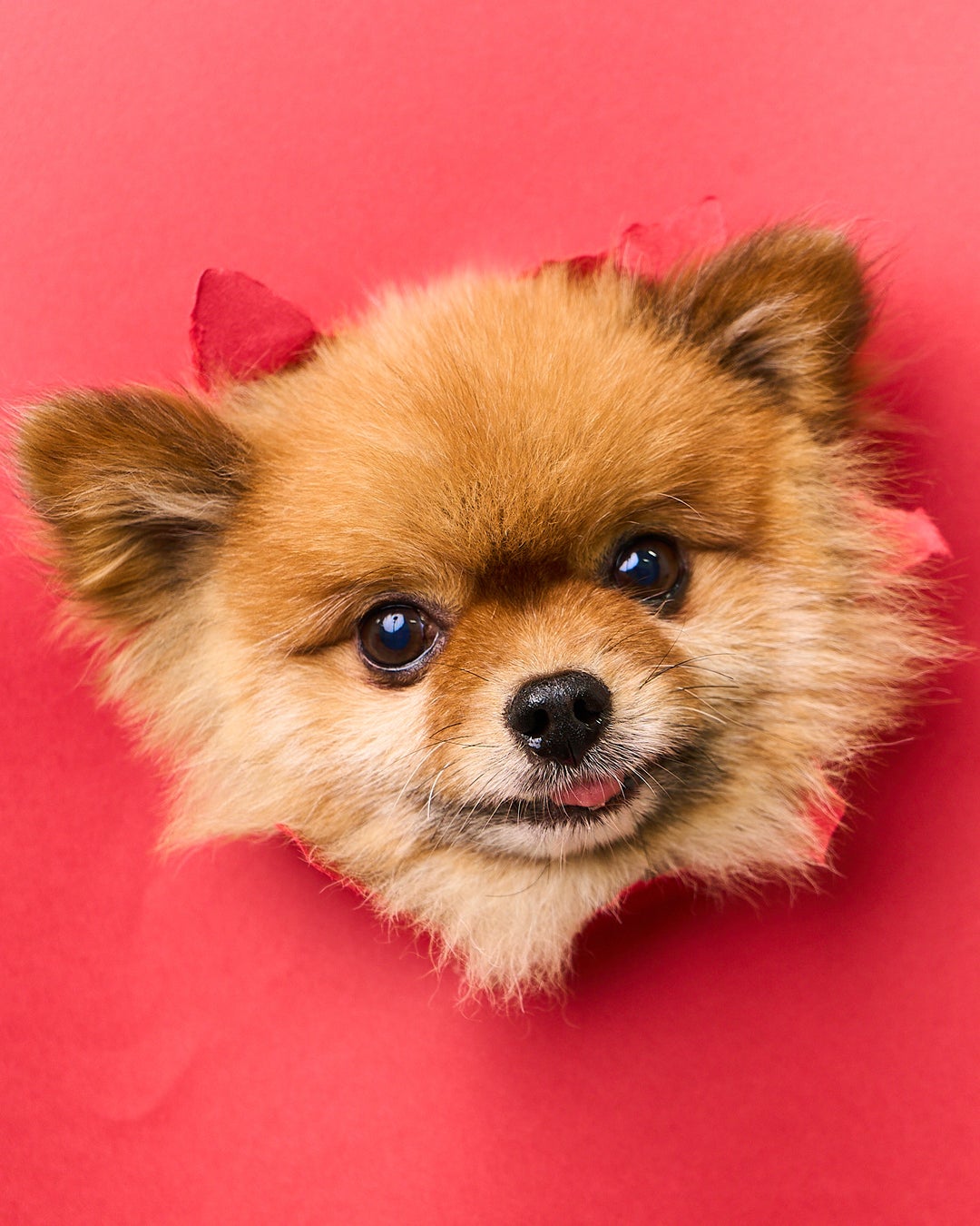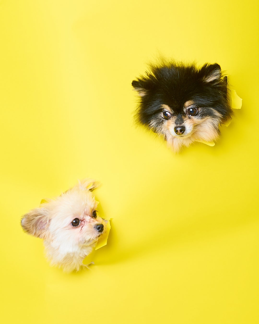 ベルギー在住でワンちゃんを専門に撮影している写真家 Hondermooi さんが、ワンちゃんがスタジオを駆け回り希望どおりのポーズをとってくれないことを逆手にとり、楽しそうに紙を破って顔を出す豊かな表情を撮影したポートレイト写真にインスパイアされ「PET MODE」でも Hondermooi さんにリスペクトを込め、「PET MODE」の写真家、原哲也が撮ります。
