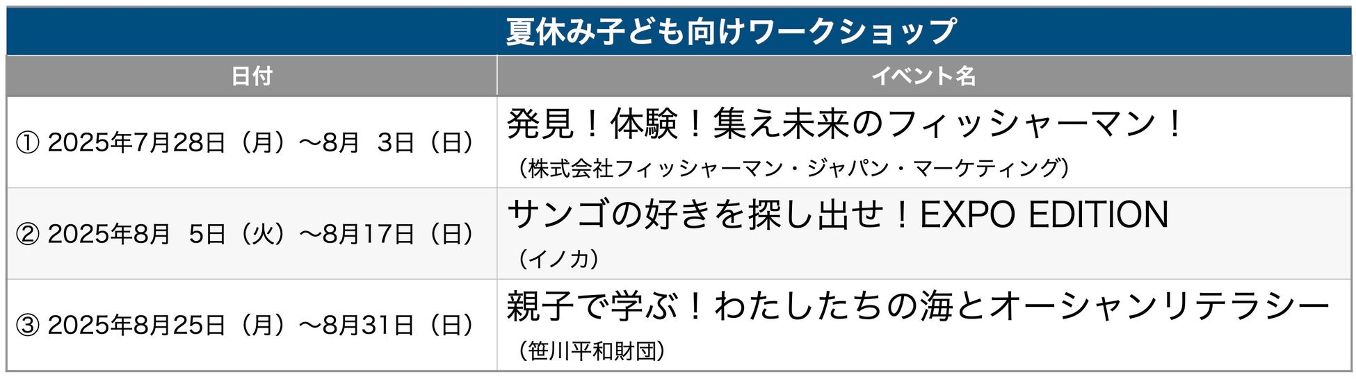 2025年7月28日(月)〜8月3日(日)の週は、海や魚を扱うプロフェッショナルの仕事を体験できる「発見!体験!集え未来のフィッシャーマン!」を開催。曜日ごとに体験内容が変わるワークショップでは、海に関わる7つの職業に触れることができます。8月5日(火)〜8月17日(日)に開催されるのは、サンゴの謎に迫るシチズンサイエンス「サンゴの好きを探し出せ!EXPO EDITION」。約2週間に渡って実施されるワークショップは、サンゴの不思議を学びながら、子どもたちが研究者になれる特別プログラムです。夏休み最終週の8月25日(月)〜8月31日(日)に開催される「親子で学ぶ!わたしたちの海とオーシャンリテラシー」は、ゲームやクイズ、工作などを楽しみながら、海について学ぶことができる内容となっています。