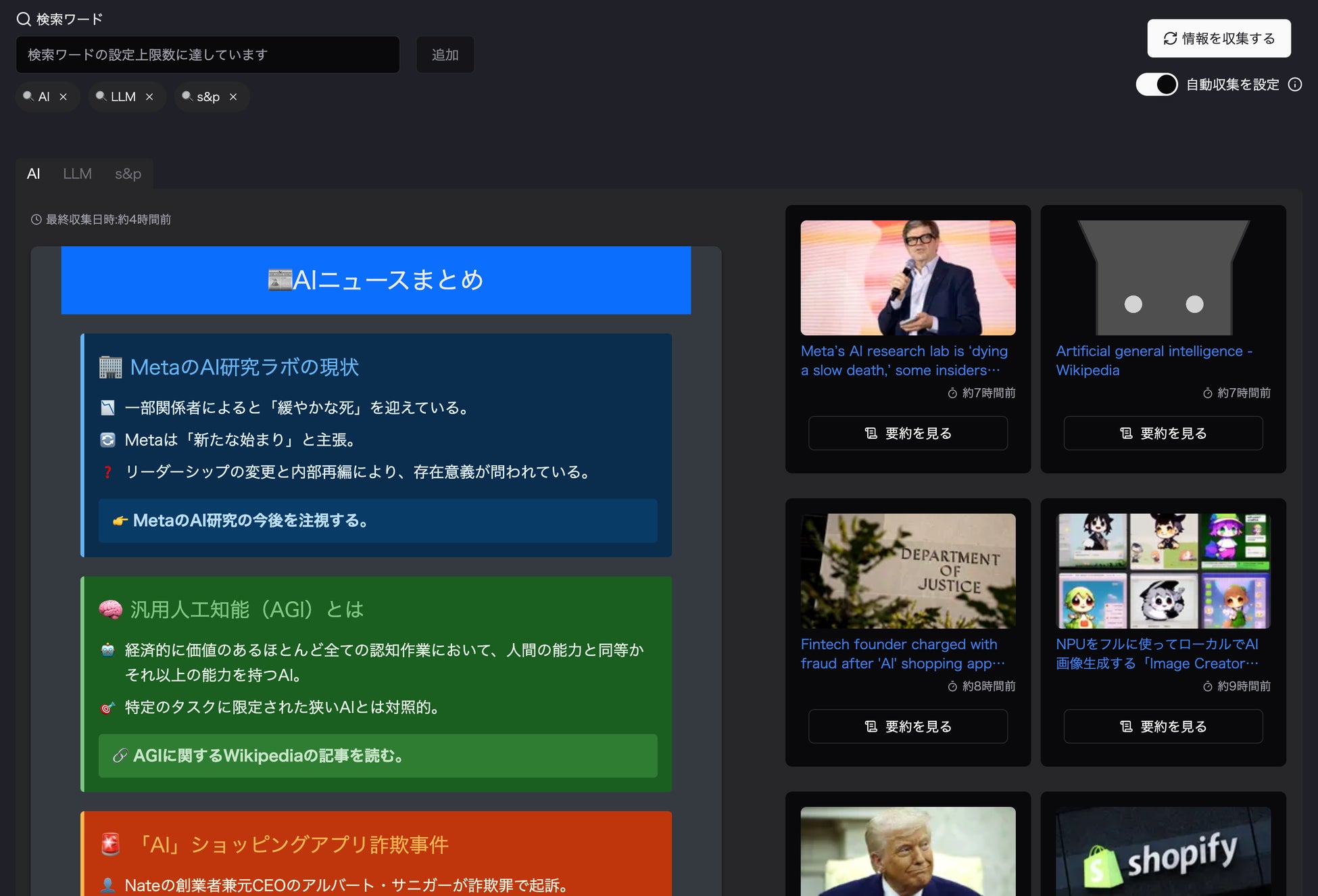 新たに、設定したキーワードに基づき、毎朝7時にAIが自動で最新情報を収集する機能を追加しました。