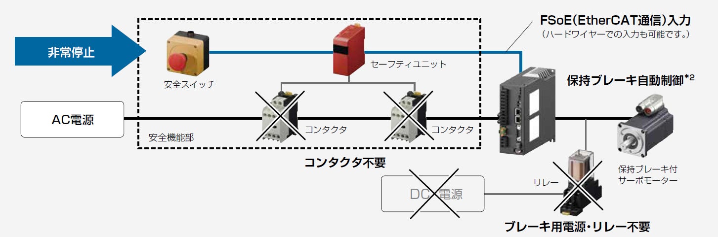 2026年9月以降に安全機能(STO・SS1-t)を標準品として搭載予定です。「モーター減速停止→モーター動力遮断+ブレーキ保持」といった動作をドライバ単体で実現します。コンタクタやリレーが不要のため、省配線、省スペースに貢献します。