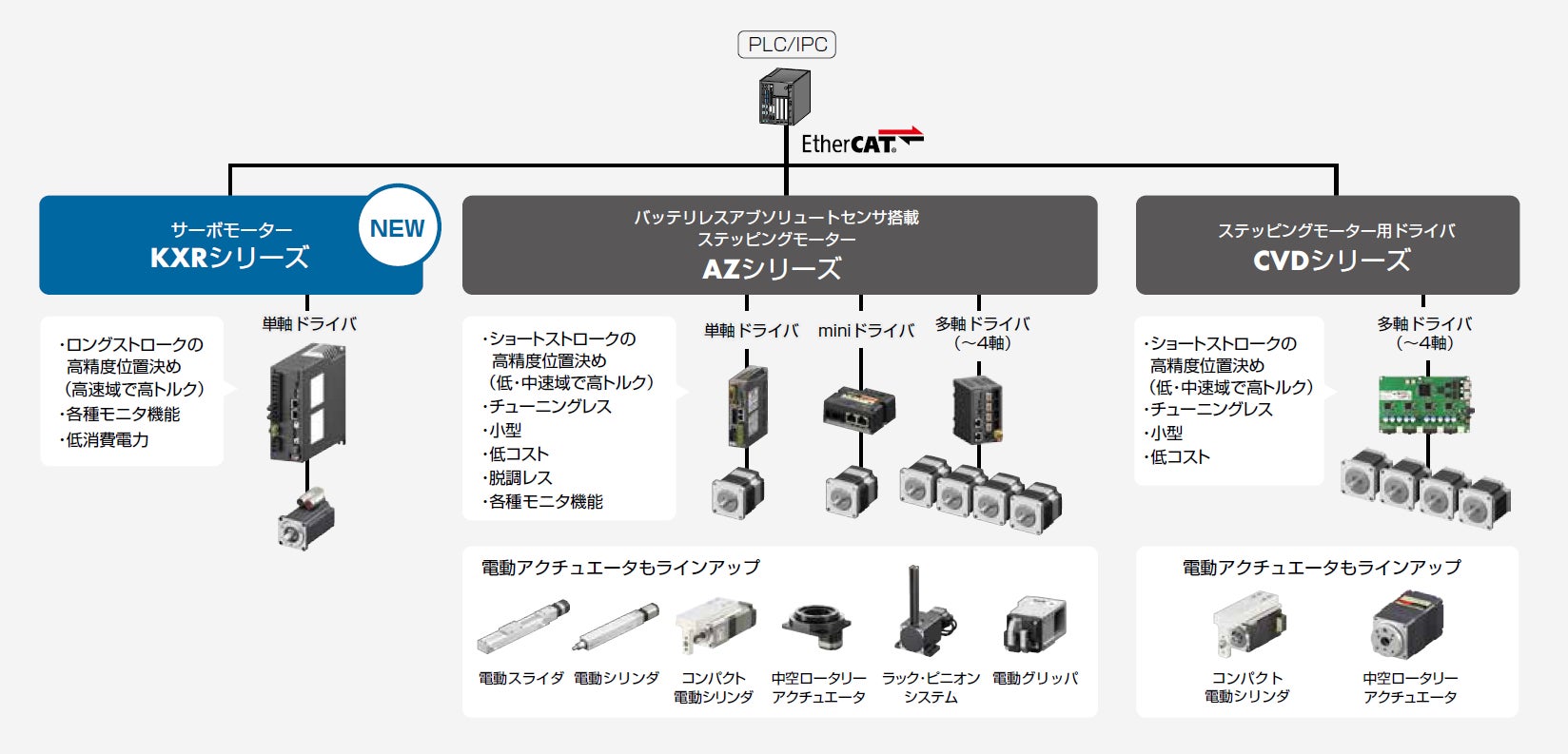 ステッピングモーターを中心とした、これまでのEtherCAT®通信対応製品にサーボモーターを追加し、用途に合わせた最適提案を実施します。
