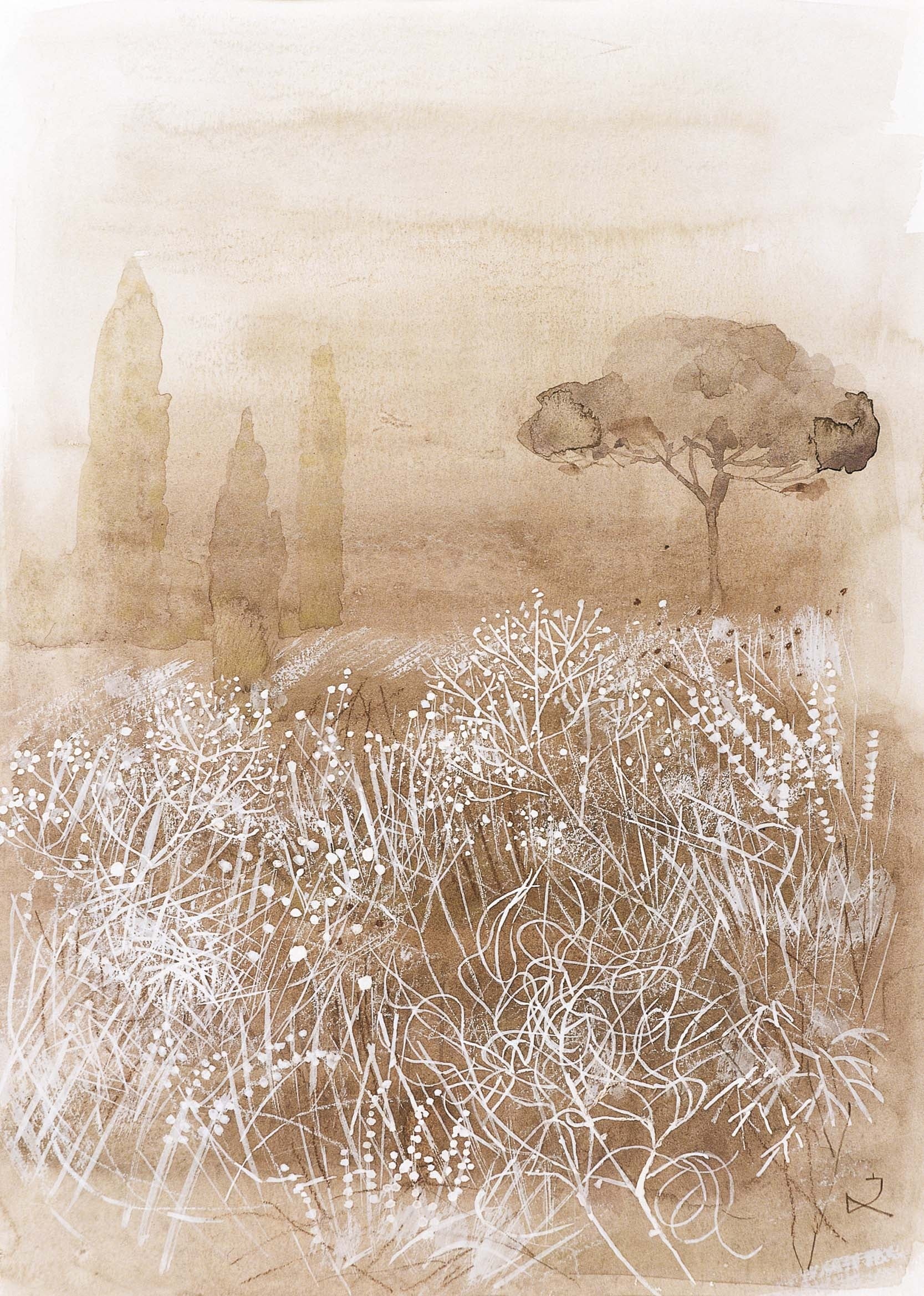 「トスカーナの田園に咲き乱れる野の花たち。なだらかな丘を埋める麦畑。オリーブの林。丘の上の城塞のような農家。森も糸杉の道も、なにもかもが中世の世界を思わせる無垢な世界の中で、日本での荒びた私の心は洗われ、生き返った。」(『ホルトノキの下で』堀文子 幻戯書房 )