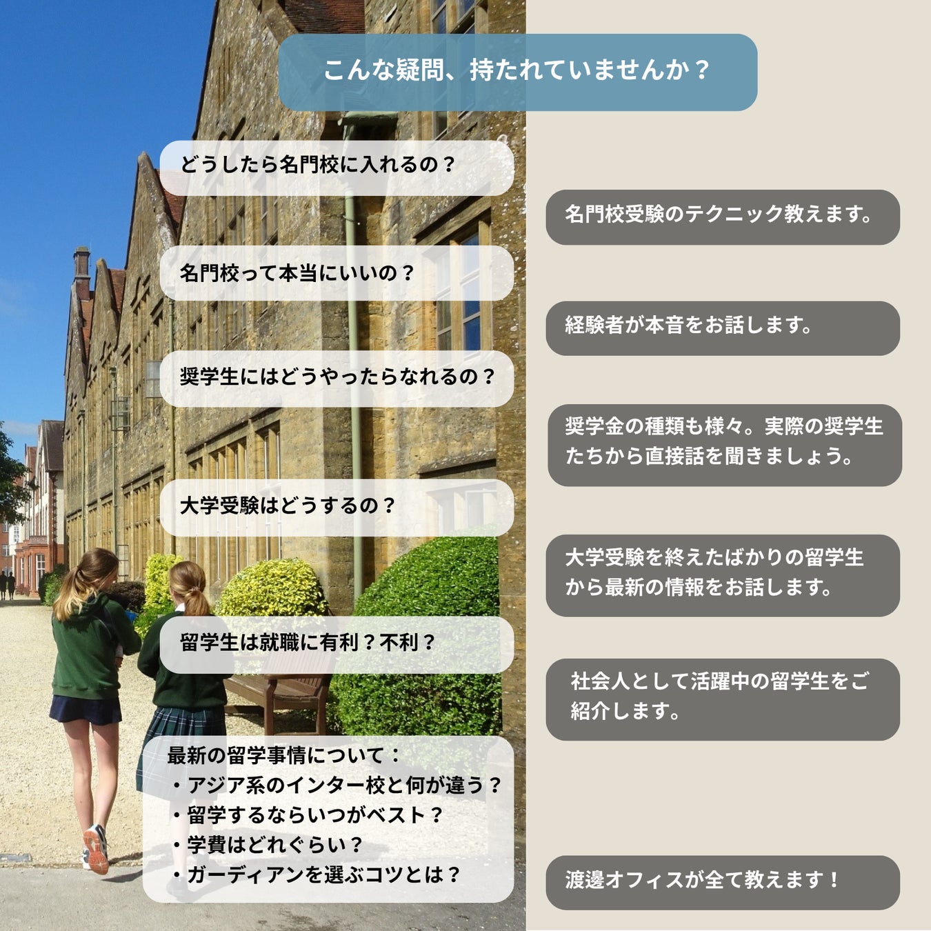 ・名門校の筆頭、Winchester校、Harrow校、Shrewsbury校等の現役生、卒業生達を始めとする約20名の留学体験者らと自由に交流し、お話いただけます。