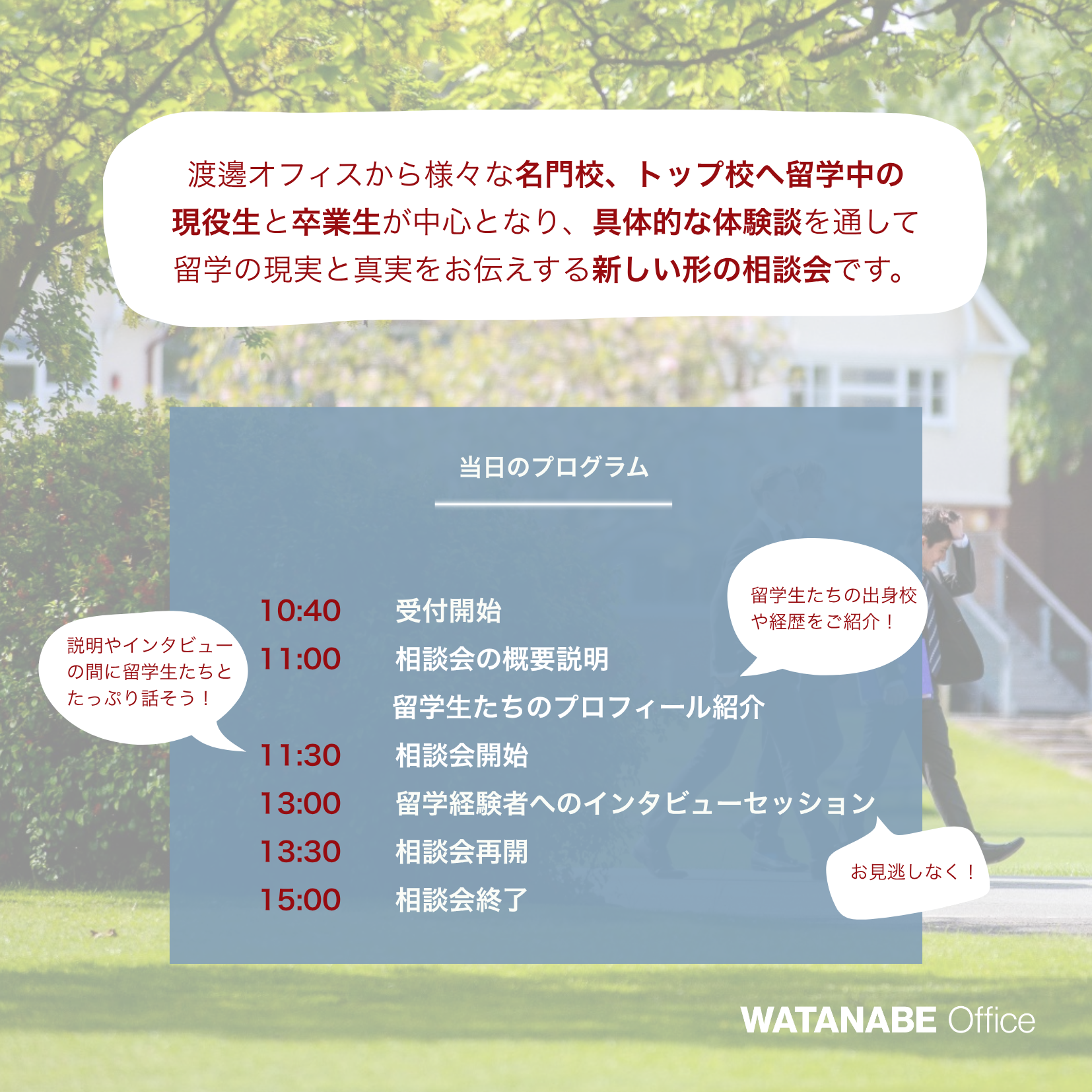 留学生の体験談ほど現実に近く、より学校生活を身近に感じられるものはありません。そこで渡邊オフィスではこの夏、これまでどこにもなかった新しい形の相談会を提案します。様々な名門校・トップ校と呼ばれるボーディングスクールに在籍している現役生、または卒業した渡邊オフィスの留学生たちが中心となり、具体的な体験談を通して留学の現実をお伝えしたいと思います。