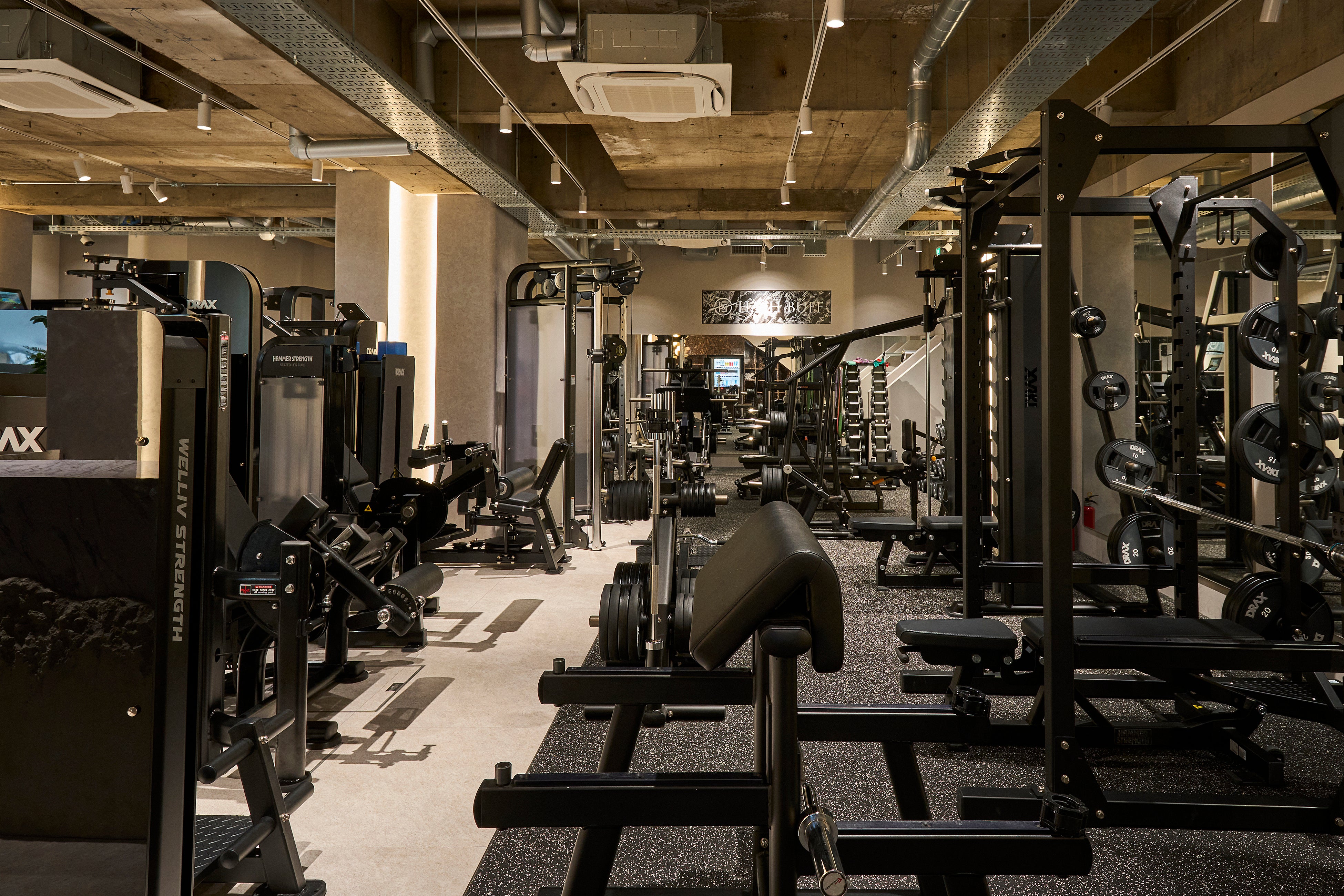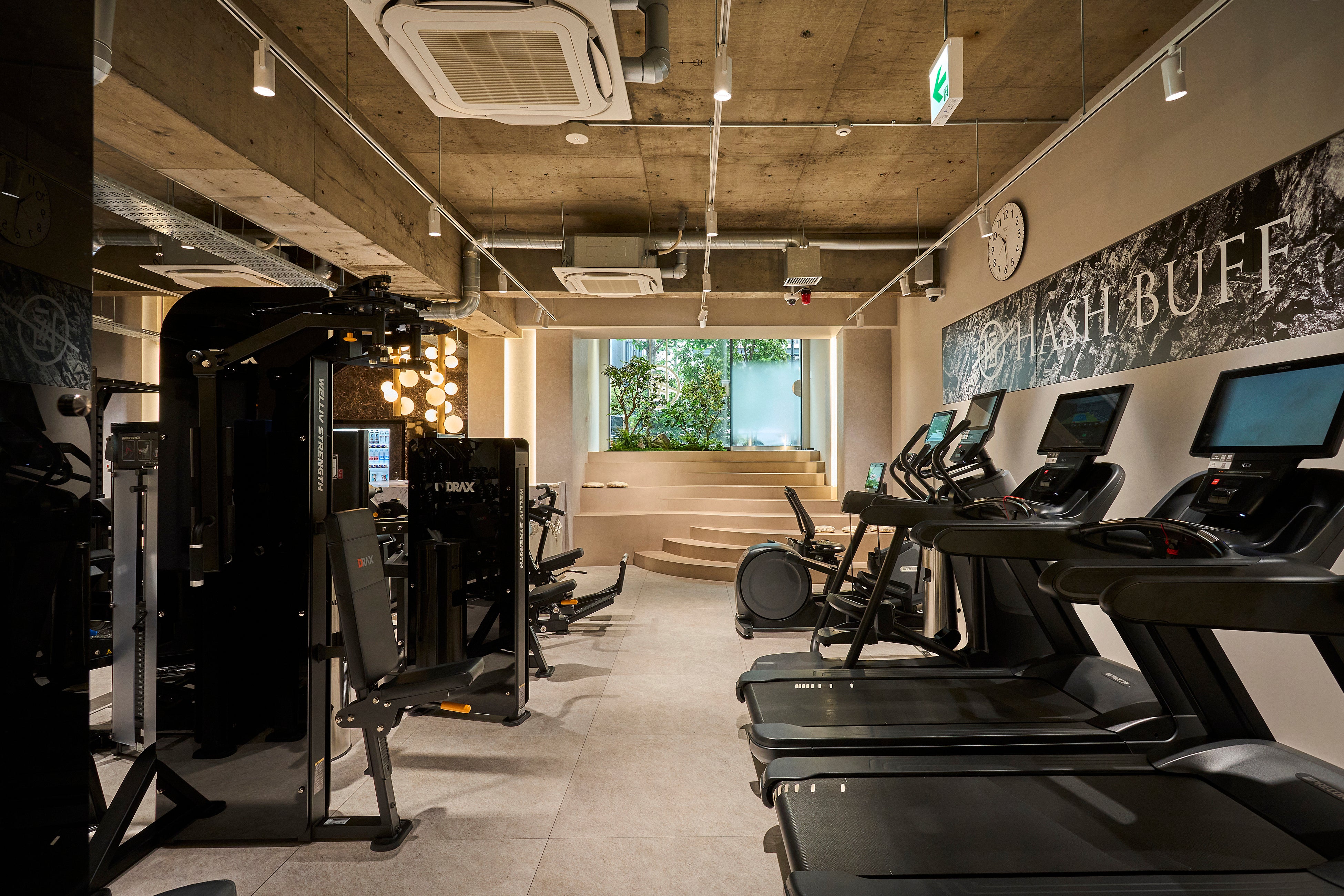 HASH BUFF麻布十番店は24時間営業のフィットネスジムであると同時に専属トレーナーによるパーソナルトレーニングが行えるジムです。「Layered Strength~~地層のように、積み重ねた努力が強靭で美しい体を作る」をコンセプトにしており、トレーニングを行う皆様が、それぞれの目標に向かって没頭できる環境作りを目指しました。