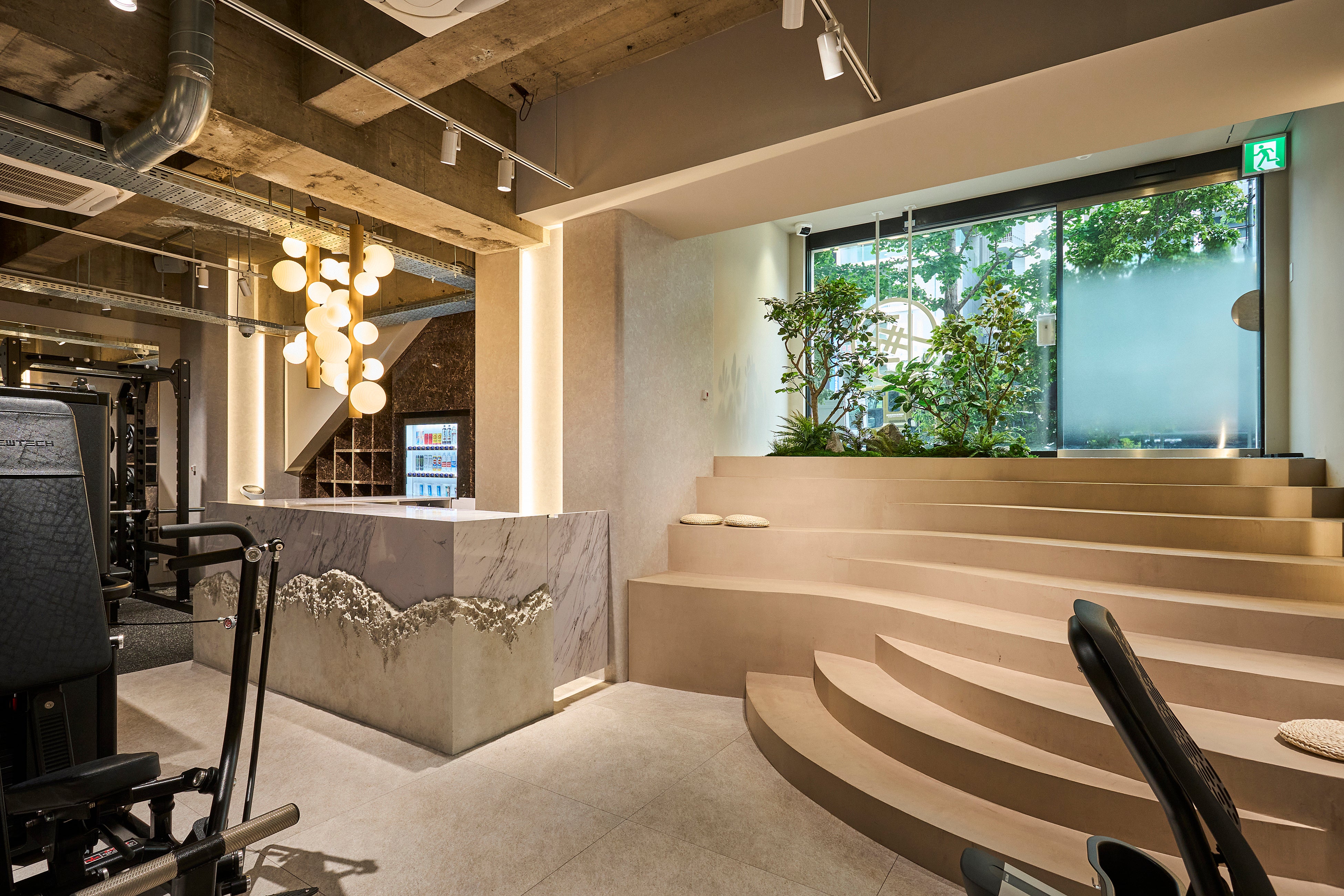トレーニングエリアは最先端のフィットネスマシン約30台を揃え、ヨガやTRXなど多様なワークアウトに対応できるフリースペースも併設しております。