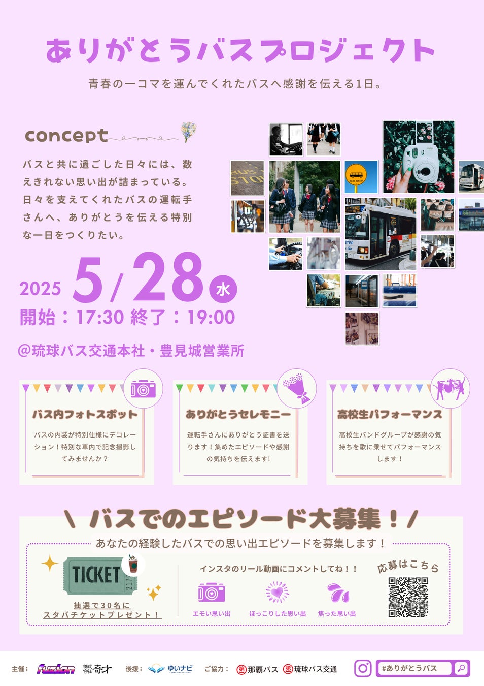 株式会社奇才(本社:沖縄県うるま市、代表取締役:福原 海里)と学生団体Fuzion(運営会社:株式会社Relie, 本社:東京都港区、代表取締役:栗栖 崇)は、高校生主導でバスの運転手へ感謝を伝える「ありがとうバスプロジェクト」を2025年5月28日(水)、沖縄県豊見城市の琉球バス交通営業所にて開催いたします。バスを通して過ごしてきた“青春の日々”を振り返り、運転手さんに感謝の想いを伝える特別な一日。高校生が主体となって運転手さんへの感謝の想いをかたちにしたイベントを実施いたします。