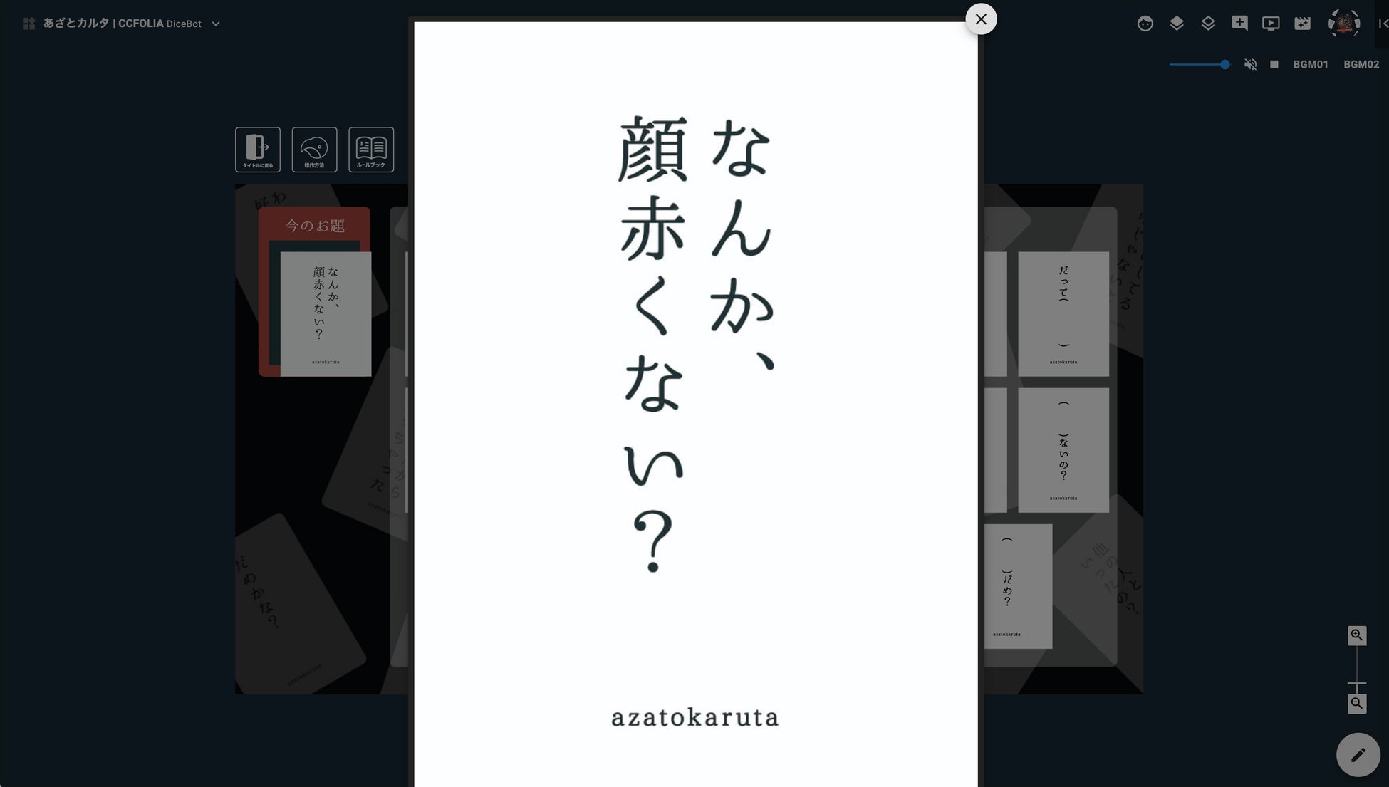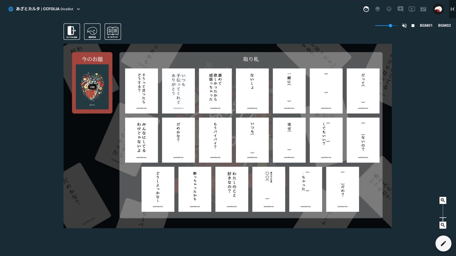 『あざとカルタ』は、無料のオンラインセッションツール『ココフォリア』上でプレイできます。