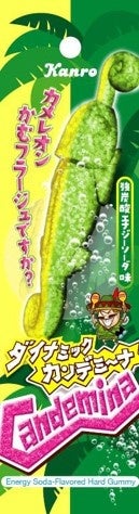 「ダイナミックカンデミーナ」はこれまでイカやタコの形で発売され、約11センチの大きさで注目を集めましたが、今回はリアルなカメレオンの形。見た目のインパクトはもちろん、強炭酸エナジーソーダの味わいで食べ応えも抜群です。