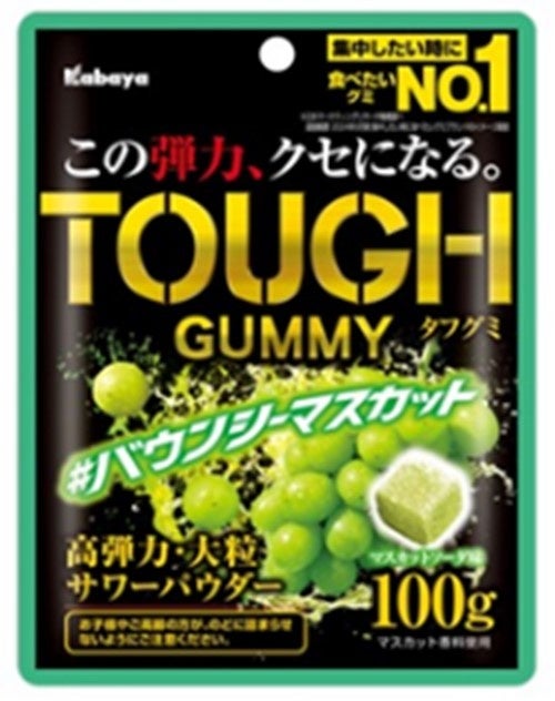 “この弾力、クセになる。”のコピーでおなじみのタフグミ。クセになる高弾力と噛むほどに広がるジューシーなマスカットの甘み・酸味の相性が抜群です。