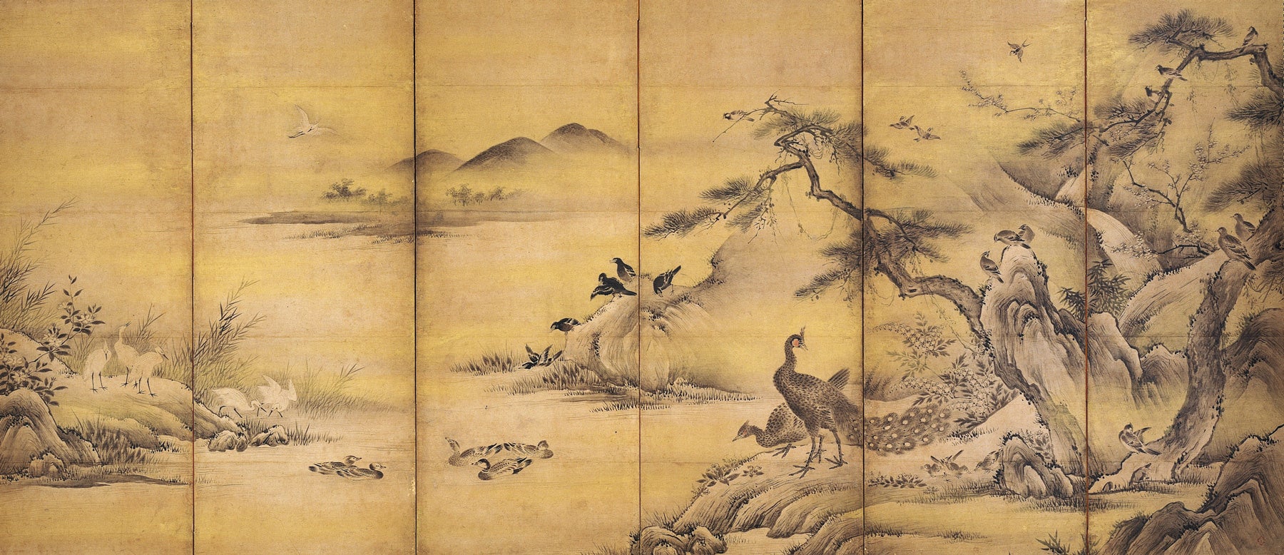柔軟な筆遣いが印象的な狩野派による行体花鳥画の優品。深い奥行きとともに横への広がりを感じさせる典型的な元信様となっている。