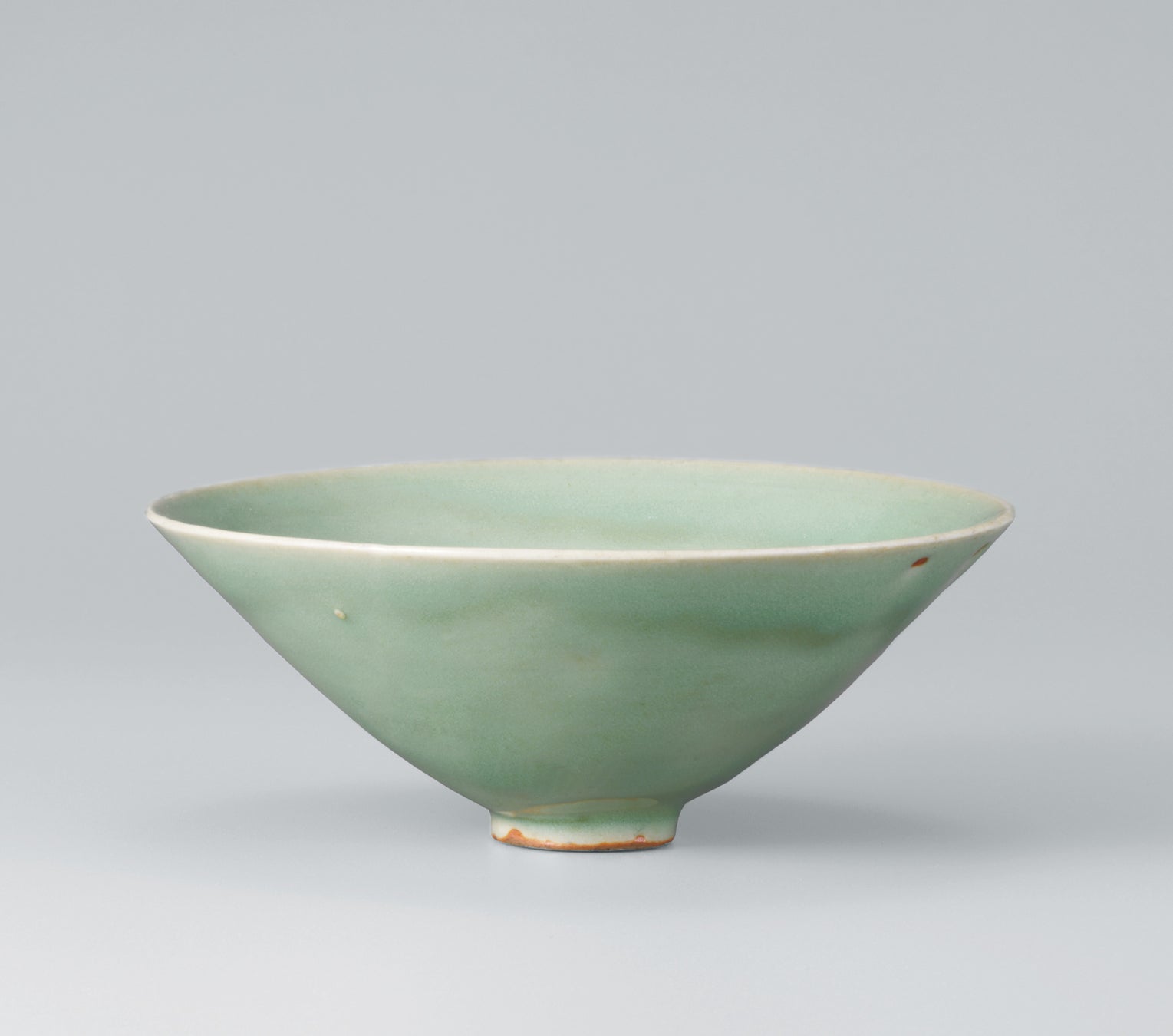 夏に好まれる青磁の平茶碗。口が大きく開いていることから茶が冷めやすく、また、淡い青緑色の釉薬により、見た目も涼やかである。