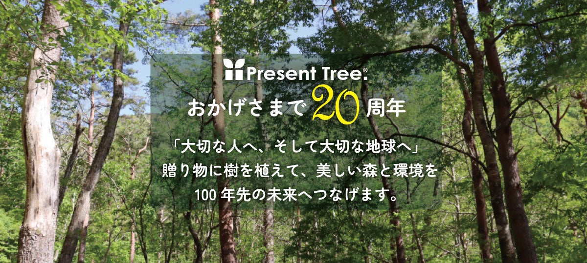 「大切な人へ、大切な地球へ」美しい森と環境を未来に引き継ぐプロジェクト「Present Tree(プレゼントツリー)※」は、20周年を記念し、祝花の代わりに樹を贈る「サスティナブルな“お祝い”のカタチ」を提案いたします。