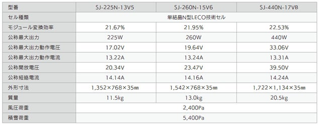 太陽光発電パネルの彩色はオールブラックを採用することで高い意匠性を実現しました。日本の狭小屋根に最適な小型パネル(最大出力225W・260W)と汎用モデル(同440W)の組み合わせにより設置可能容量を最大化します。太陽電池セルにはN型LECO技術※1とSMBBハーフカットセル※2といった最新技術を搭載することで高出力と低劣化を実現しました。また、架台は高耐久性に優れたアルミを採用し塩害地域にも対応可能な耐腐食性を確保しています。住宅環境に調和するデザインと価格競争力を両立させるだけでなく、製品保証20年・リニア出力保証30年という長期保証を付帯することで日本ブランドならではの安心を提供します。