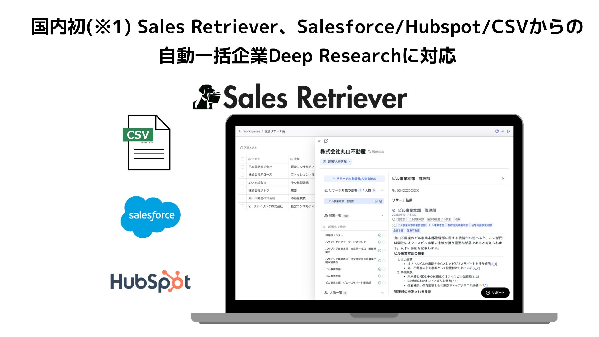 国内初(※1) Sales Retriever、Salesforce/HubSpot/CSVから一括で企業をDeep Researchできる新機能を提供開始