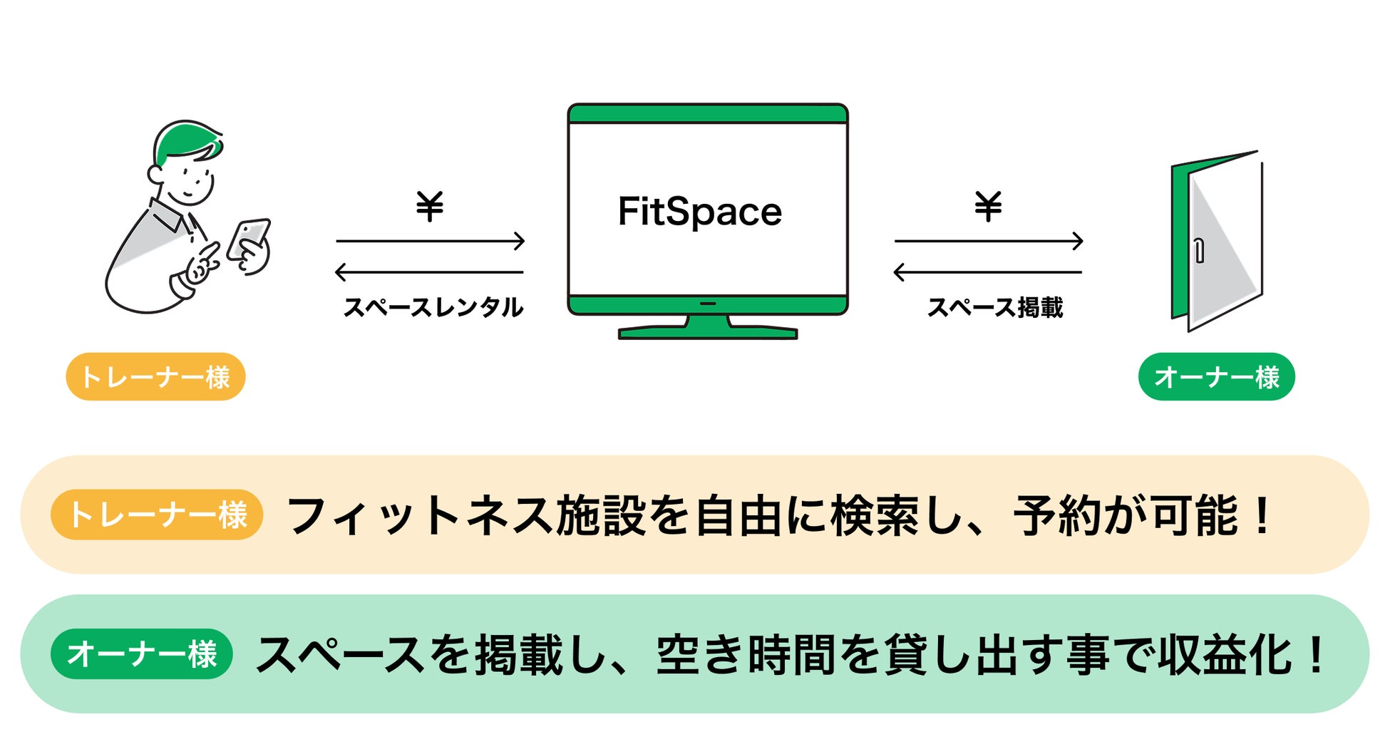 FitSpace(https://fitspace.co.jp/)は、トレーナーが理想のトレーニング環境を見つけ、施設オーナーがスペースの空き時間を利用して収益化できる、フィットネス特化型のシェアリングプラットフォームです。すでに全国250以上の施設が登録され、パーソナルトレーニングやグループレッスンに適したスペースを提供しています。