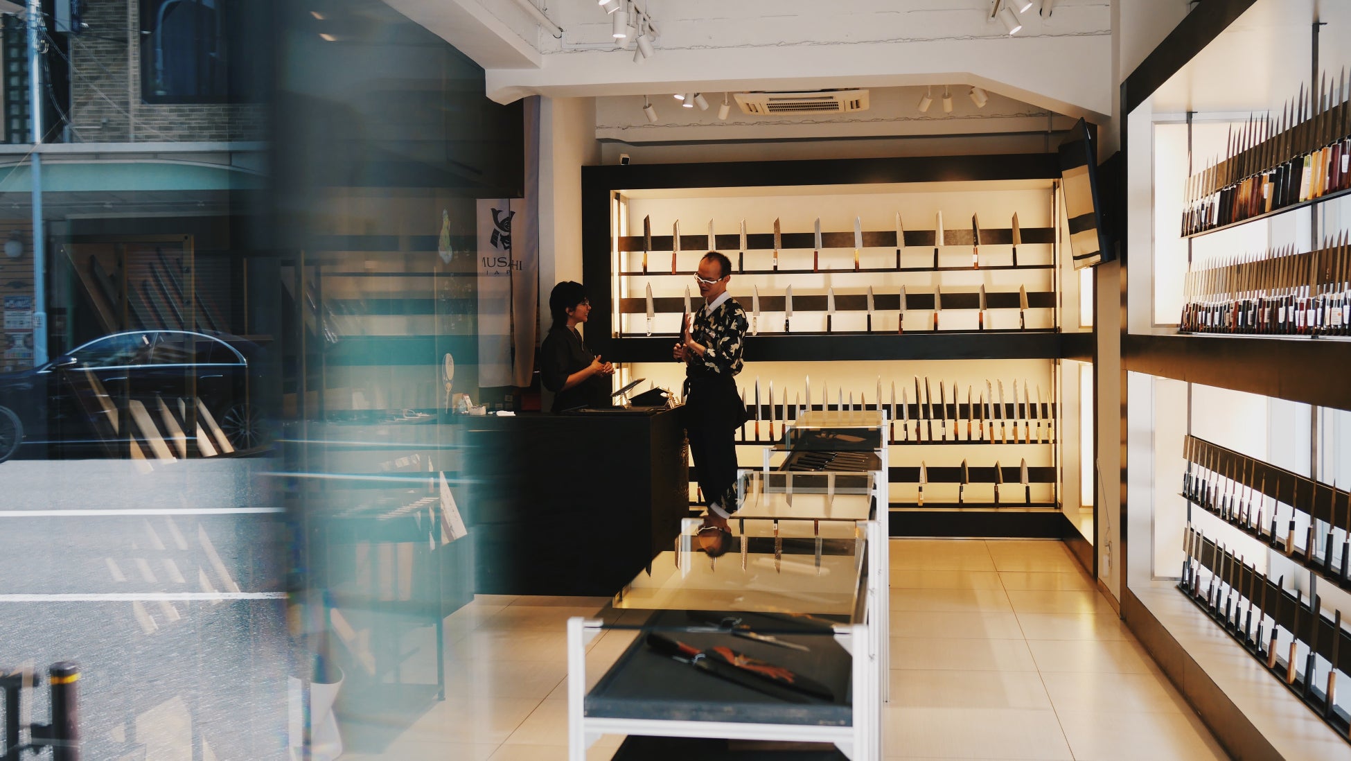 ”食”の専門商店街として知られる合羽橋の北に位置する、MUSASHI JAPANのメインストア。ガラス張りのディスプレイと伝統工芸要素を散りばめた内装が特徴です。