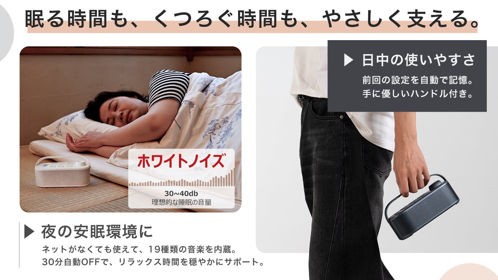 「海のさざ波」「小鳥のさえずり」「優しいピアノの旋律」など、19種類のホワイトノイズを本体に内蔵。30分後自動OFF、スマホもネット接続も不要。音だけで眠りへ導きます。前回使った音量やモードを自動で記憶する機能を搭載。ご年配の方も毎回設定に迷わず、すぐに快適な音で楽しめます。手に優しいハンドル付きで、キッチンからリビングへ、寝室から書斎へ。どこでも気軽に持ち運べます。