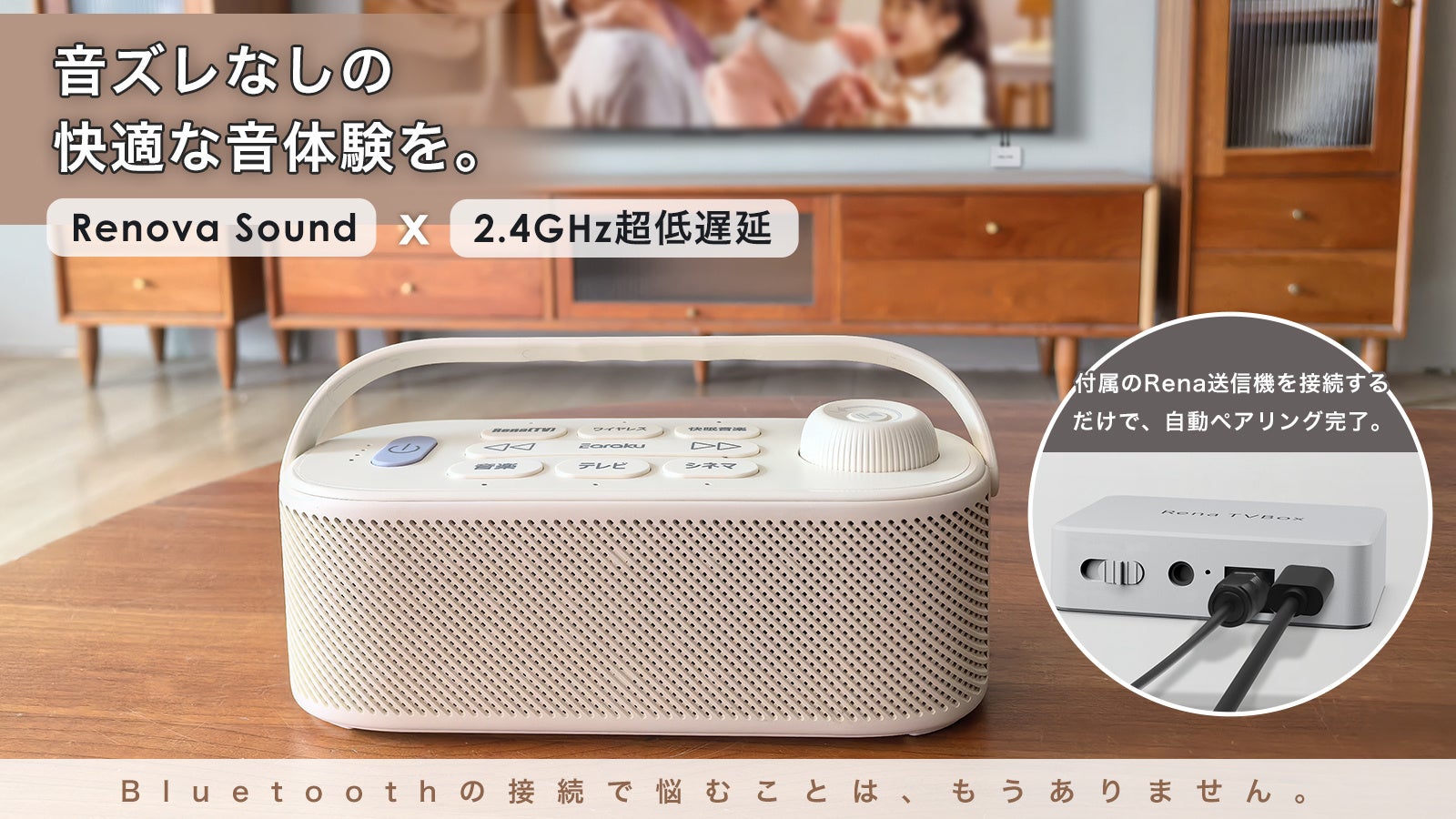 Bluetoothの接続に迷うこともなく、ご高齢の方でもすぐ使えます。付属のRena送信機を使用したい機器に差し込むだけでスピーカーと自動ペアリング可能です。Rena送信機をを用いてデバイスと接続した場合、デバイス間の音声のずれがわずか25ms未満の遅延しかないため、体感として音と映像のズレをほとんど感じさせません。音ズレのない動画視聴やオンライン会議にも使えます。