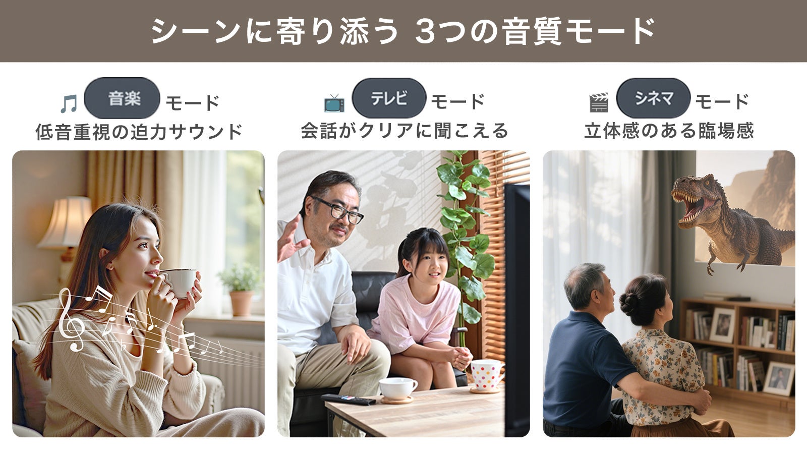 「シネマ」モード:立体感のある音響で、映画館のような臨場感を再現。