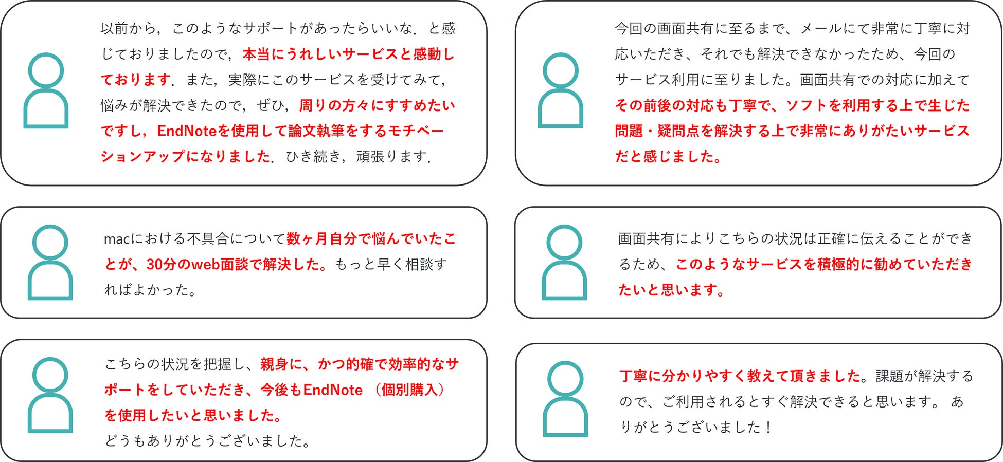 2025年2月時点でお客様からのレビュー件数は446件あり、平均評価は4.9(5点満点)と非常に高い評価をいただいております。「数ヶ月悩んでいた問題が30分のWeb面談で解決した」、「自分で何時間も悩んでいたことがすぐに解決できた」、「質問の意図をすぐに理解し、助けてもらえた」といったお声をいただいています。現在、文献管理ソフトはEndNote 以外にも数多くありますが、多忙な研究者の方々が貴重な時間をより多く研究活動に充てるためには、効率的かつ柔軟なサポート体制が不可欠と考えています。今後弊社では単なるテクニカルサポートを提供するだけでなく、研究者一人ひとりの研究活動を力強く支えるパートナーとして、学術の発展に貢献していきたいと考えています。