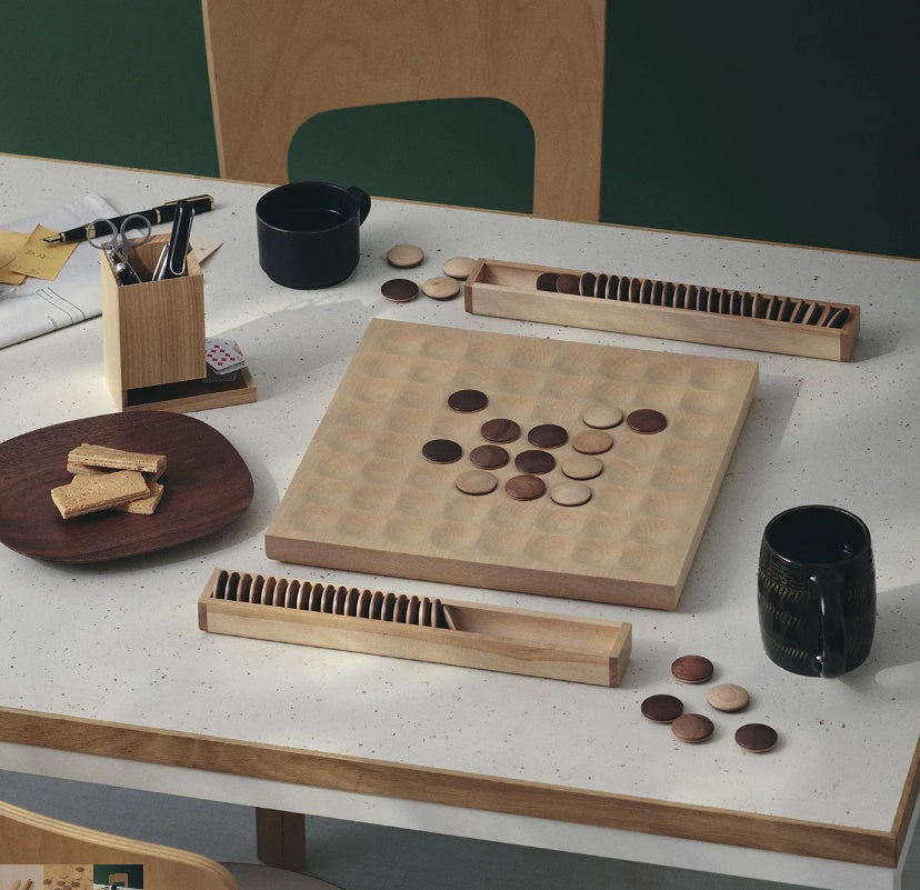 軽やかな曲面とシャープなグリッドによって形づくられた盤面はさまざまな木の表情を見せてくれます。ひとつひとつまで職人の手で丁寧に削り上げられた駒は盤面の曲面と相まって、使いやすさと同時に飾っているときの美しさも備えています。