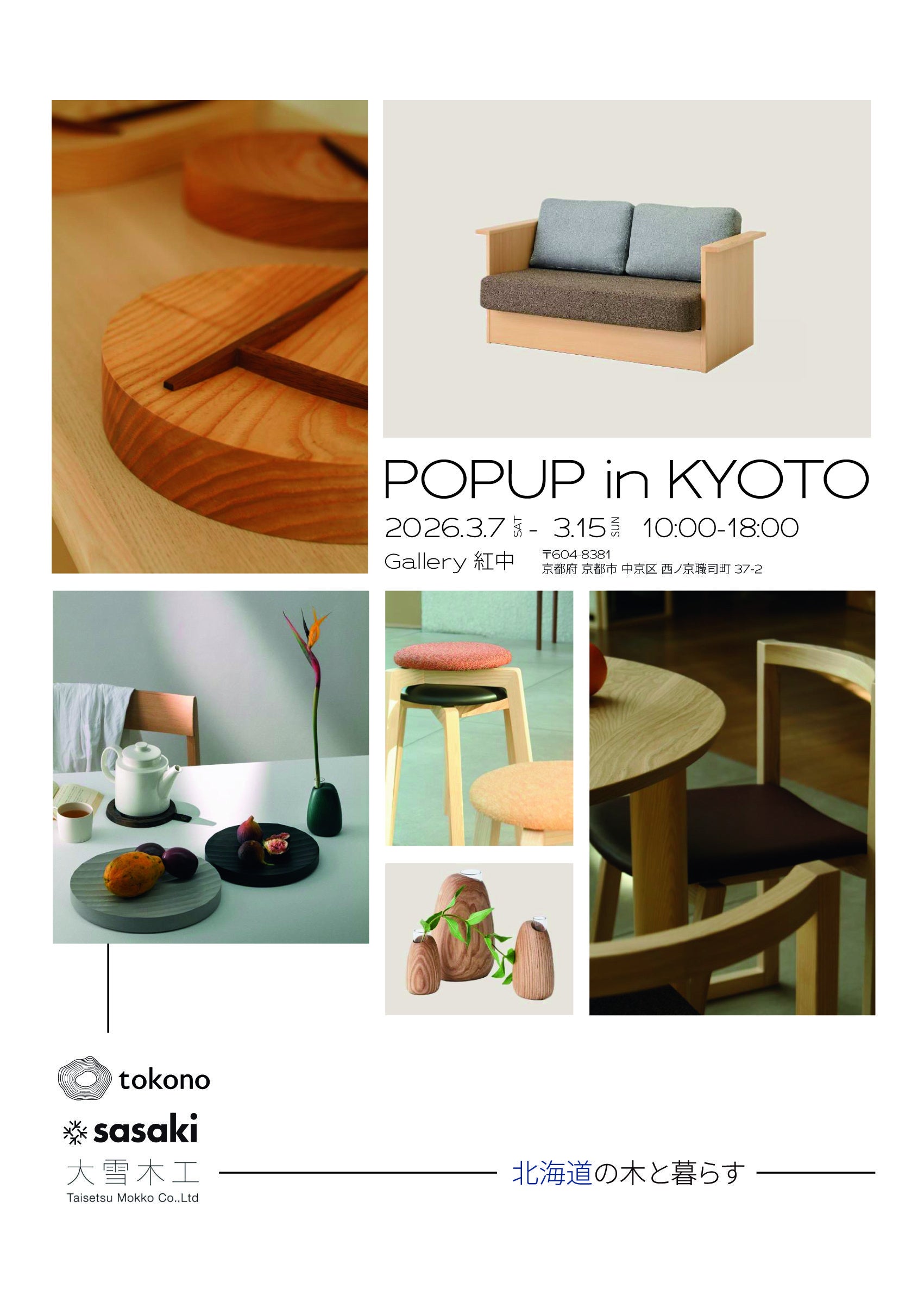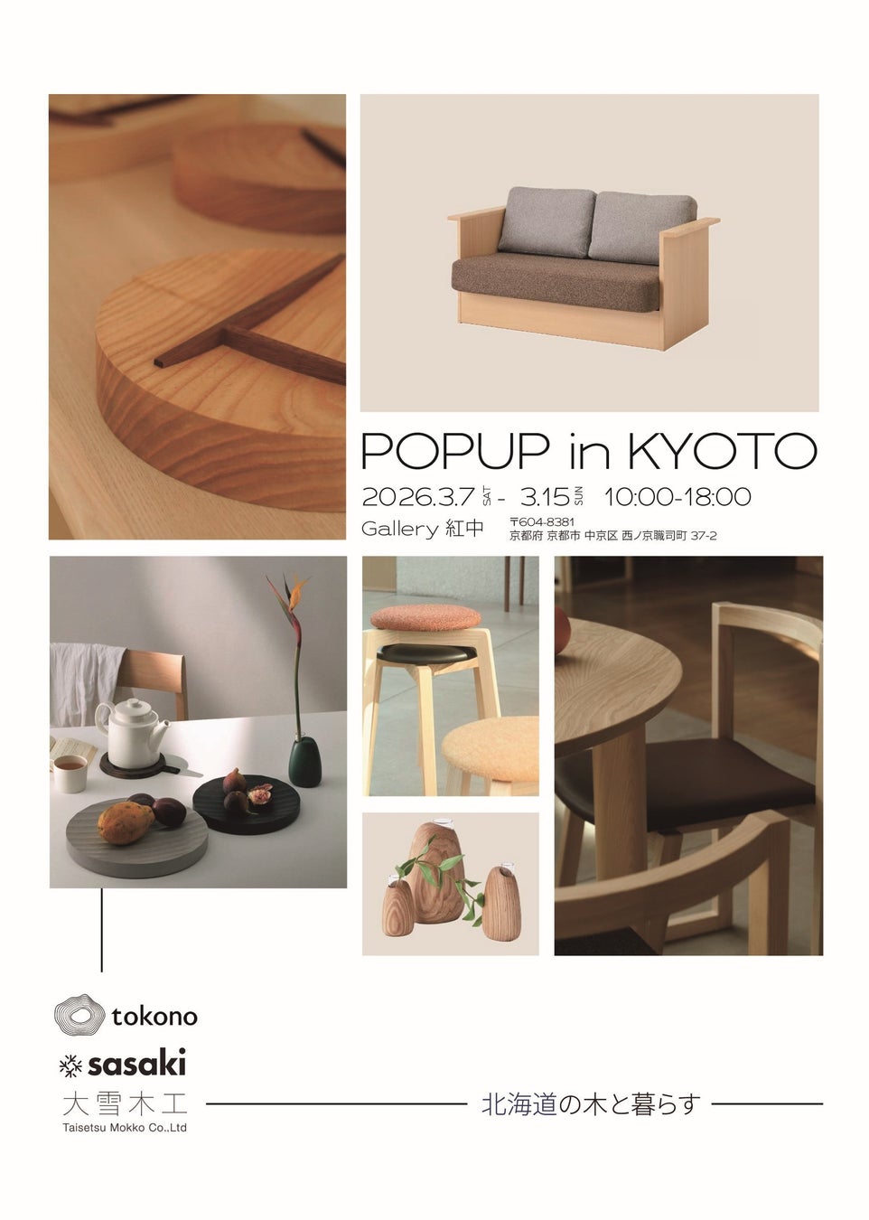 この度、株式会社紅中(本社:大阪府大阪市淀川区 代表取締役社長:中村晃輔 URL:https://venichu.co.jp/ )が運営する国産材家具・雑貨のECサイト『tokono』(URL:https://tokono-store.com/ )は、2026年3月7日(土)から3月15日(日)までの9日間、ブランド初となる期間限定ポップアップイベント『POP-UP STORE tokono×sasaki×Taisetsu Mokko』を、自社の京都オフィス1F展示スペース、Gallery紅中(京都市中京区・二条)にて開催いたします。