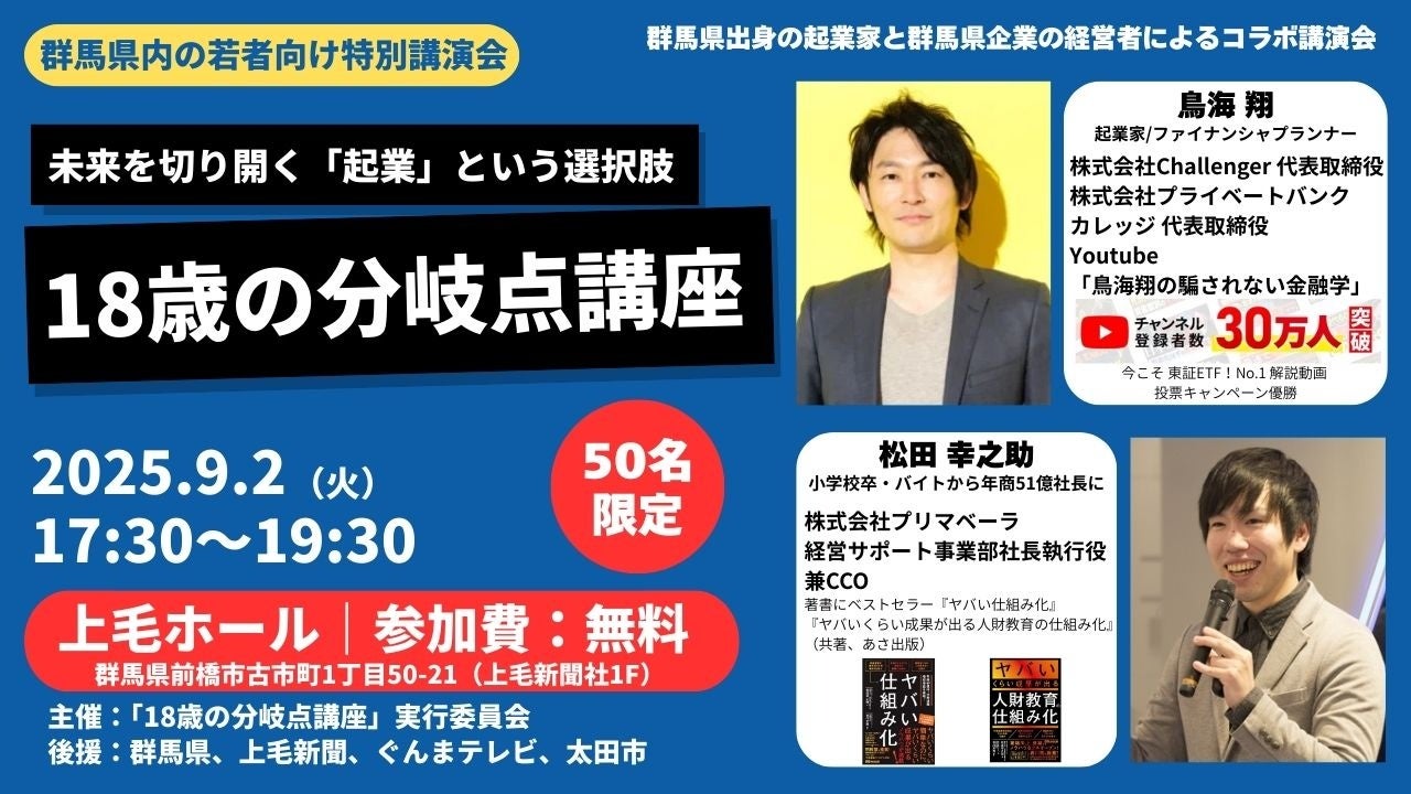 株式会社ジャスティスジャパンエンターテインメント(本社:東京都港区、代表取締役:瀬川 丈)所属の鳥海翔(株式会社Challenger・代表取締役)は、2025年9月2日、群馬県・前橋市の上毛ホールにて、若者向けの講演会「18歳の分岐点講座」を開催いたします。ゲストは群馬の企業の経営者でアルバイトから社長執行役となり、延べ400社の経営指導にも携わってきた株式会社プリマベーラ(群馬県太田市)の松田幸之助氏を招き、講演で若者の起業の意識を高めることや将来のキャリアデザインを支援します。