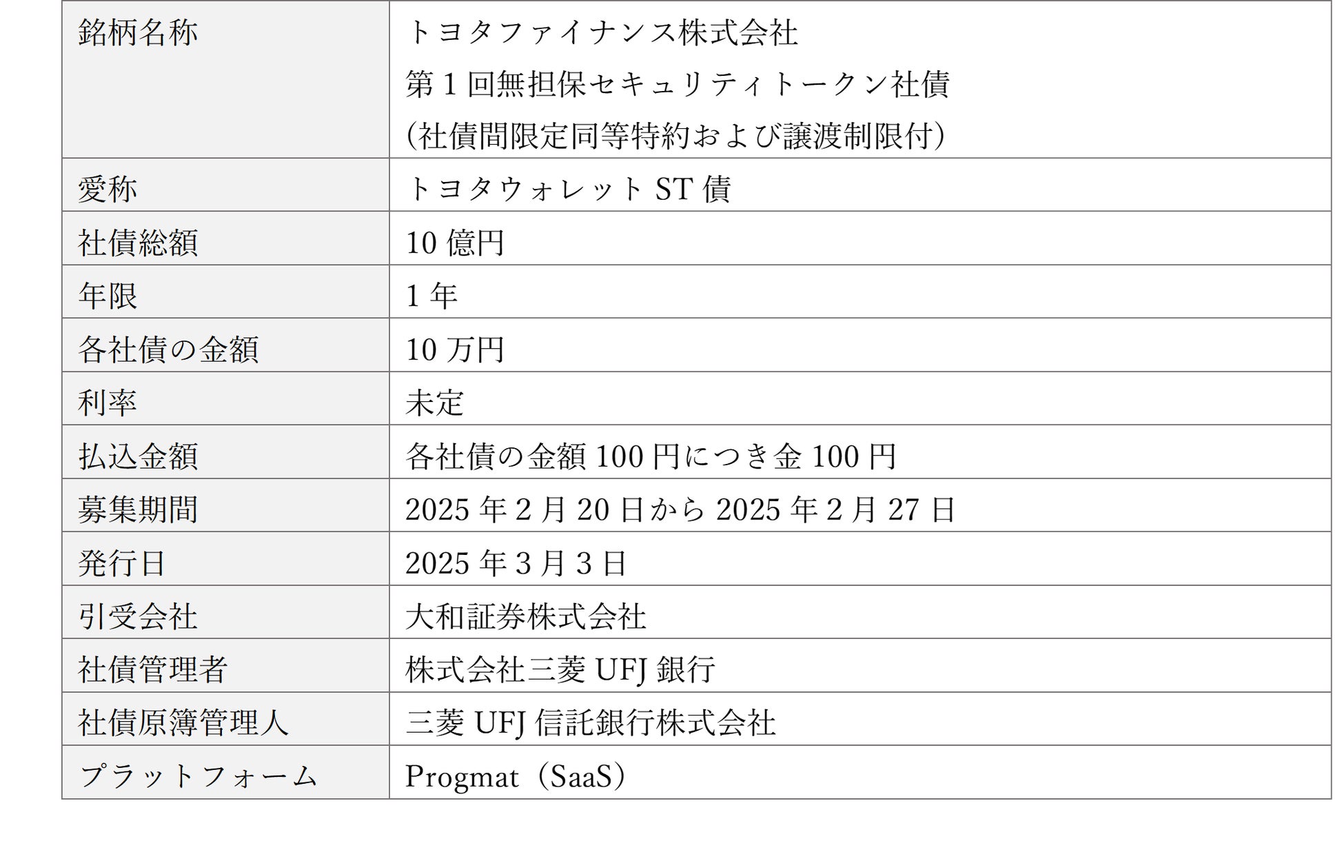 トヨタファイナンシャルサービス株式会社(代表取締役社長:頃末 広義、以下「トヨタファイナンシャルサービス」)、トヨタファイナンス株式会社(代表取締役社長:西 利之、以下「トヨタファイナンス」)、大和証券株式会社(代表取締役社長:荻野 明彦、以下「大和証券」)、株式会社三菱UFJ銀行(取締役頭取執行役員:半沢 淳一、以下「三菱UFJ銀行」)、三菱UFJ信託銀行株式会社(取締役社長:長島 巌、以下「三菱UFJ信託銀行」)、Progmat, Inc.(代表取締役:齊藤 達哉、以下「Progmat社」)は、トヨタグループとして初となる公募型セキュリティトークン社債[1] (以下「本ST債」)の発行を予定しておりますのでお知らせいたします。