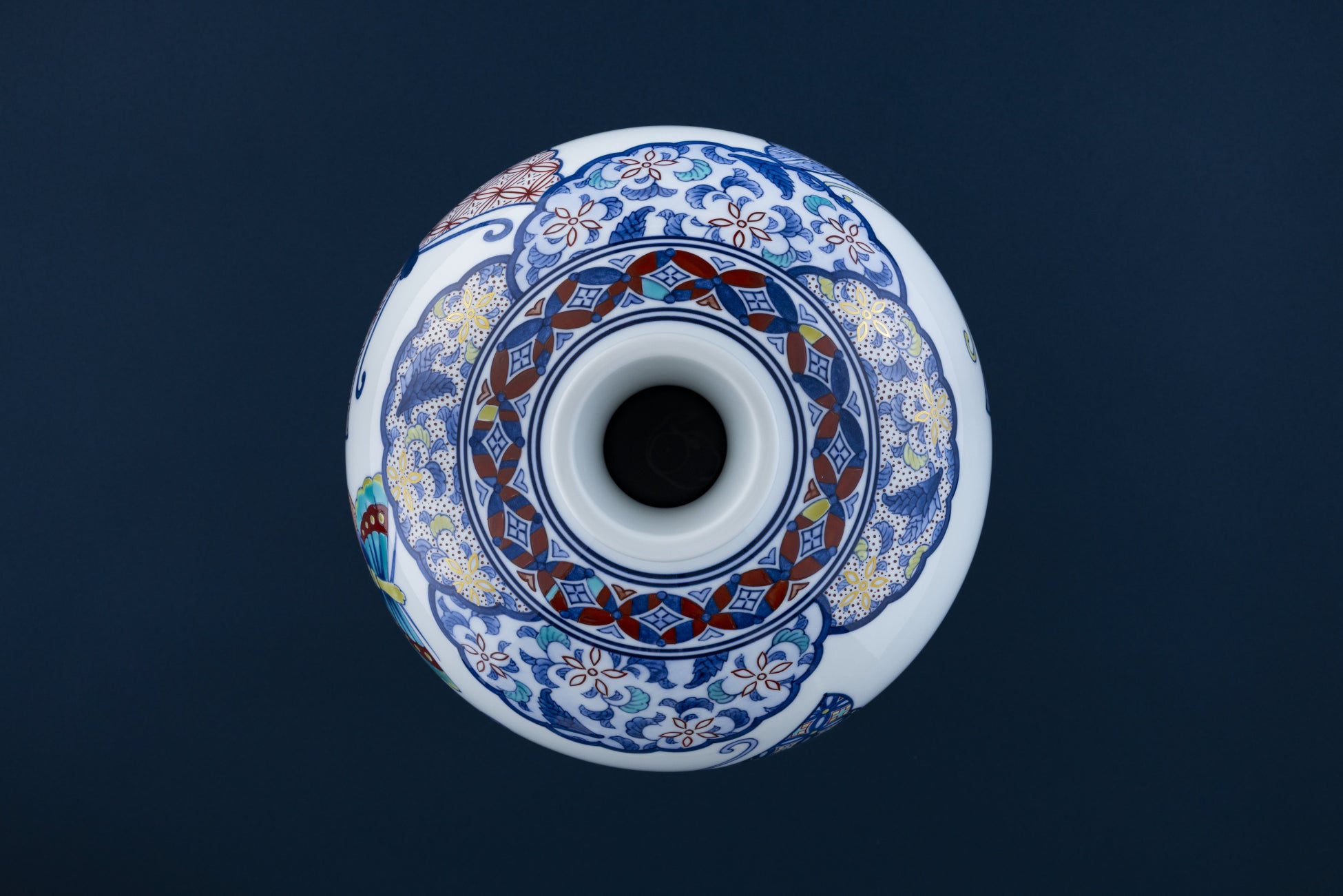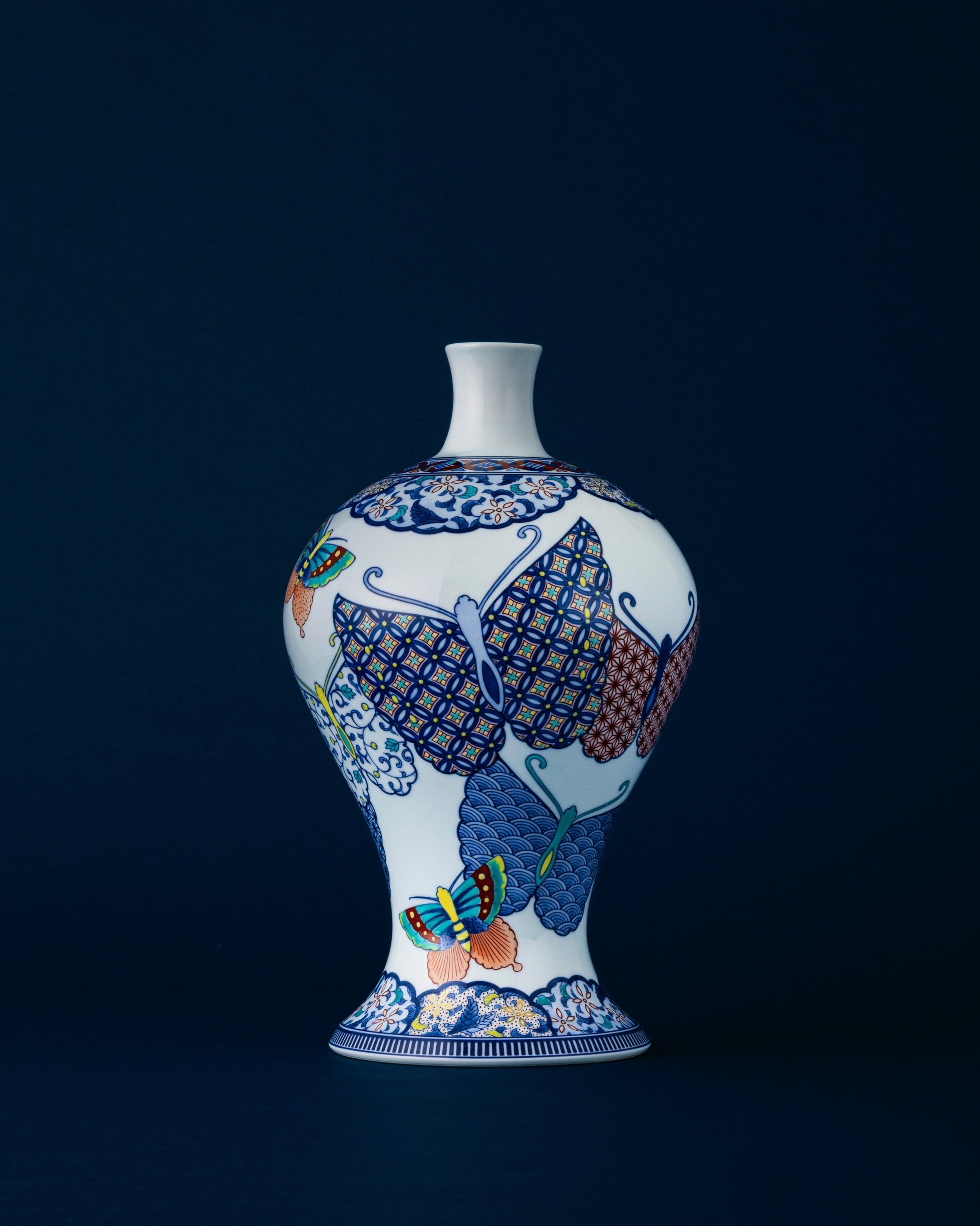 吉祥紋の一つである蝶紋は、永遠の躍動・成功・未来へ続く幸せを象徴し、古くから鍋島焼に描かれてきました。生き生きとした蝶12羽は時の無限・自由な創造性を表現しています。