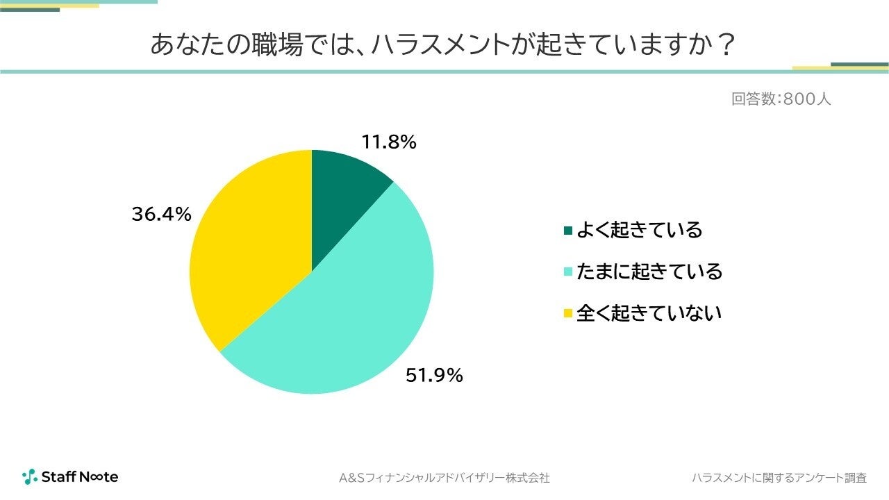 「職場でハラスメントが起きている」※1という回答が6割強(63.7%)、「全く起きていない」は4割弱(36.4%)となりました。