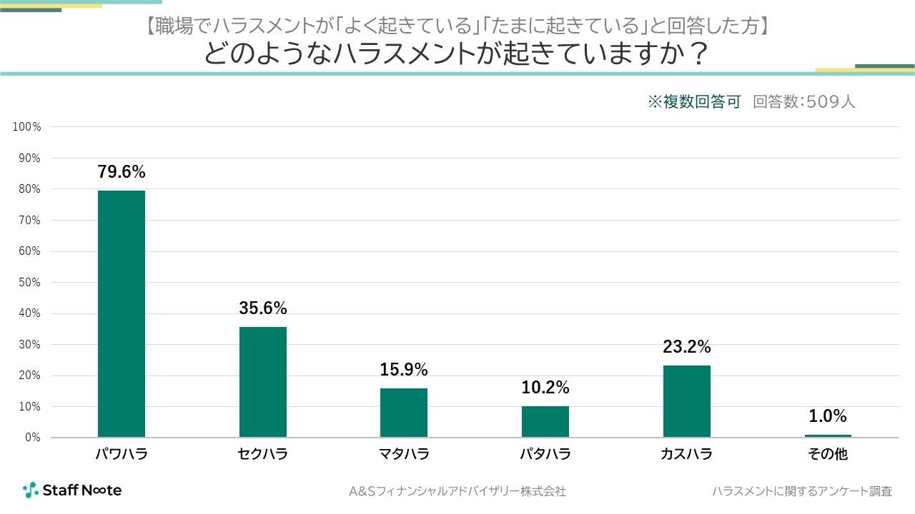 職場で起きているハラスメントは、「パワハラ」が圧倒的に多く約8割(79.6%)で、次いで「セクハラ」(35.6%)、「カスハラ」(23.2%)となりました。
