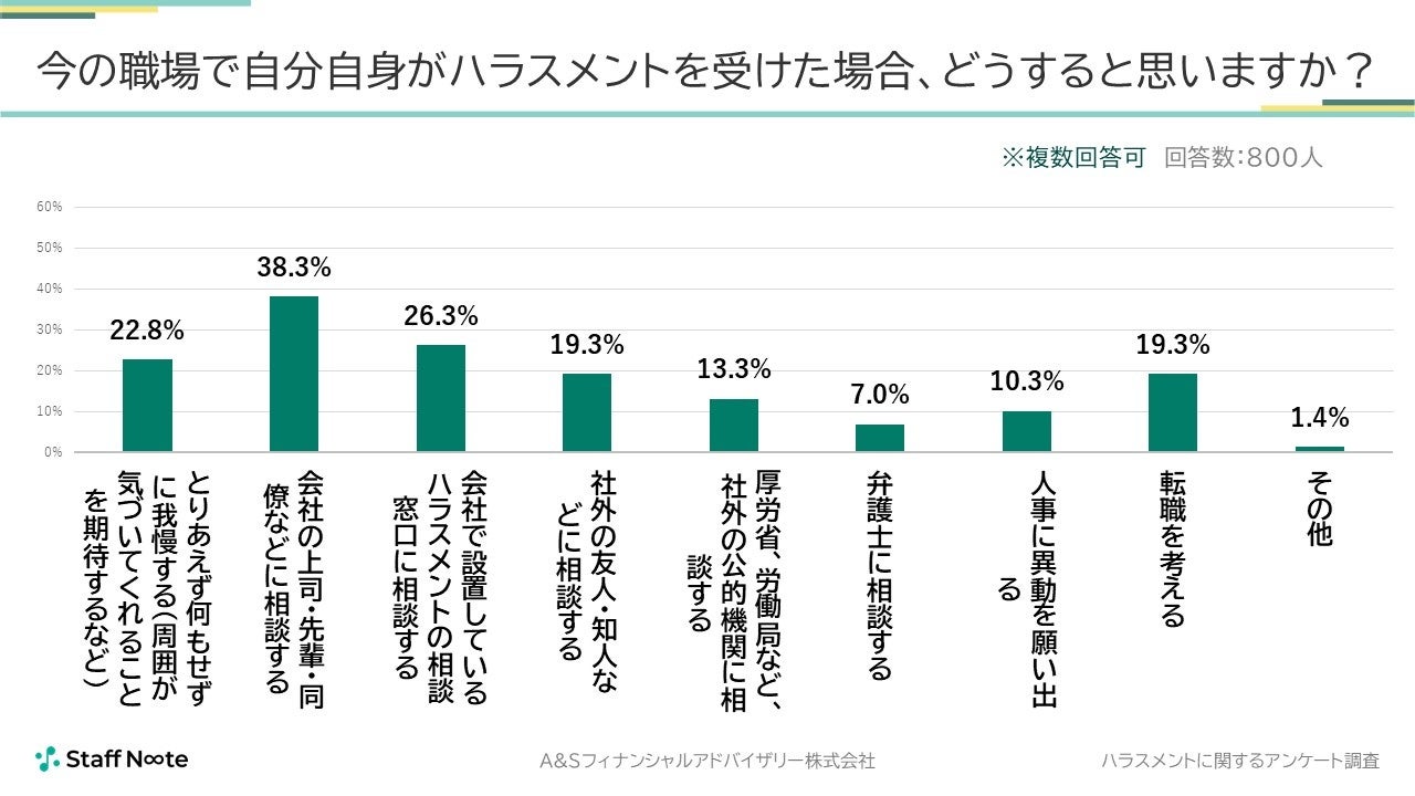 「自分自身がハラスメントを受けた場合にどうするか」を聞いたところ、1位は「会社の上司・先輩・同僚などに相談する」で約4割(38.3%)となりました。