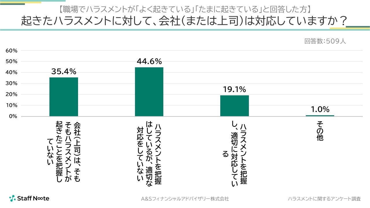 Q2で、「ハラスメントが起きている」※1と回答した人に、「起きたハラスメントに対して、会社(または上司)が対応しているか」を聞いたところ、「把握はしているが適切な対応をしていない」(44.6%)、「会社(上司)は、そもそもハラスメントが起きたことを把握していない」(35.4%)、「ハラスメントを把握し、適切に対応している」(19.1%)という順位となりました。