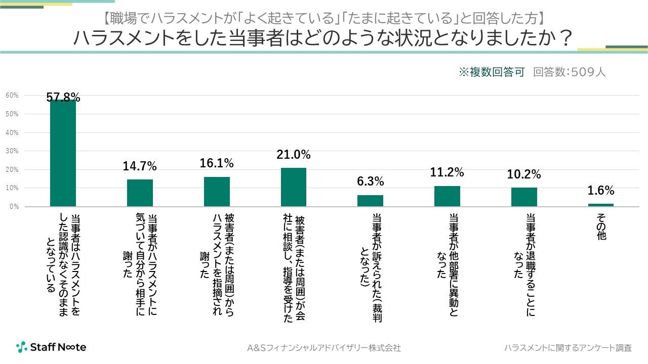 Q2で、「ハラスメントが起きている」と回答した人に、「ハラスメントをした当事者がどのような状況になったか」を聞いたところ、「当事者はハラスメントをした認識がなくそのままになっている」が突出して多く約6割(57.8%)となった。