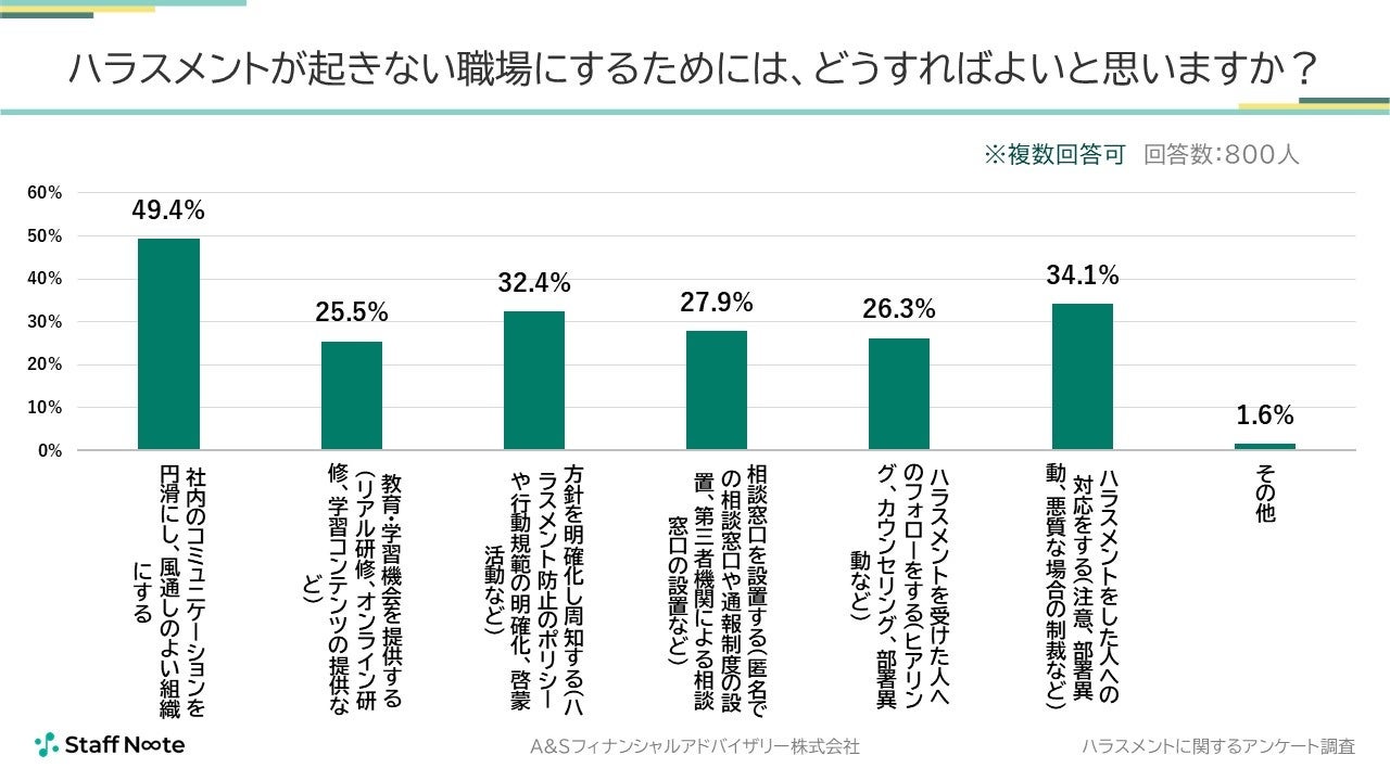 ハラスメントが起きない職場にするためには、「社内のコミュニケーションを円滑にし、風通しのよい組織にする」という回答が最も多く約5割(49.4%)に達しました。次いで「ハラスメントをした人への対応をする」(34.1%)、「方針を明確化し周知する」(32.4%)という結果となりました。