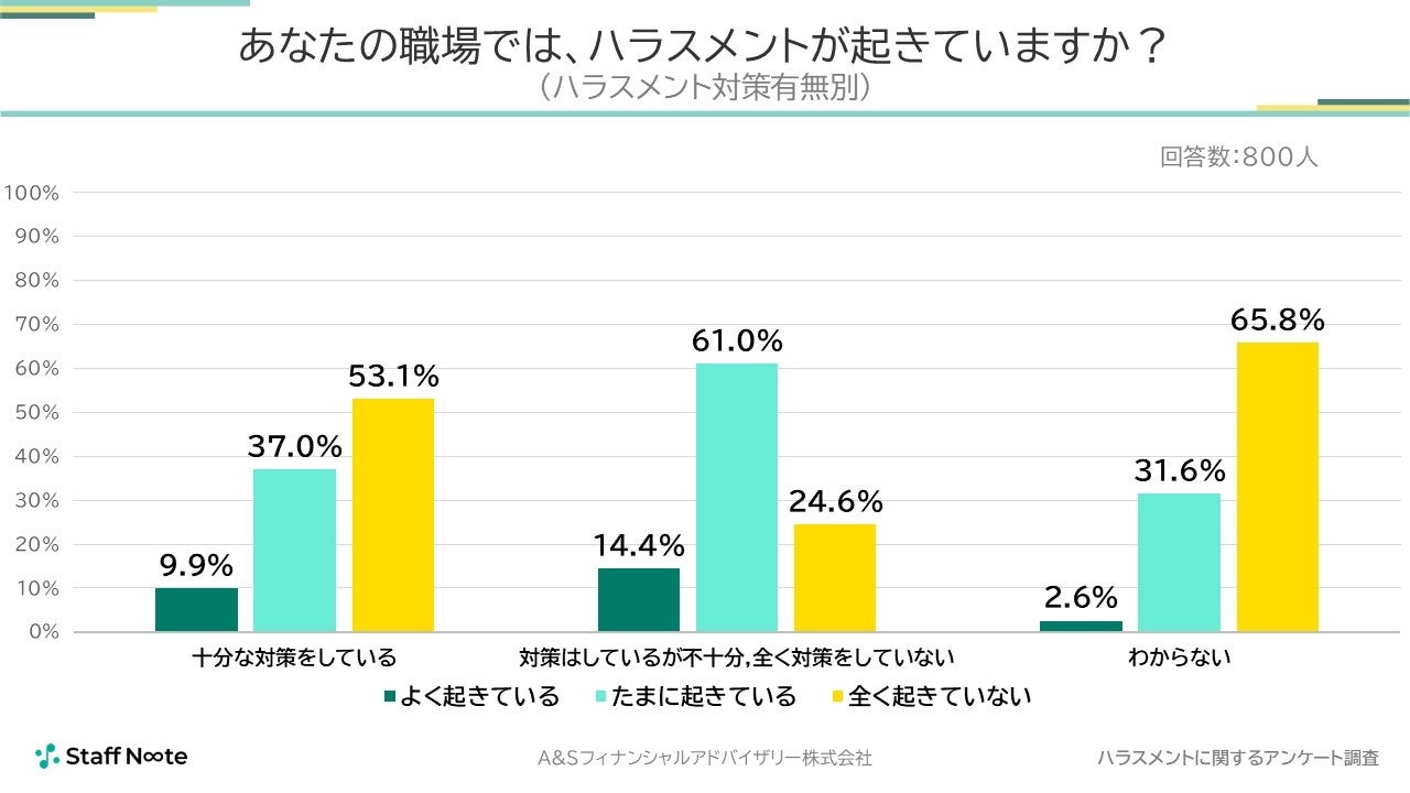 ・Q1で「十分な対策をしている」と回答した人の職場では、「ハラスメントが全く起きていない」という回答が53.1%と半数を超えましたが、「対策はしているが不十分」または「全く対策をしていない」と回答した人の職場では、24.6%に留まりました。