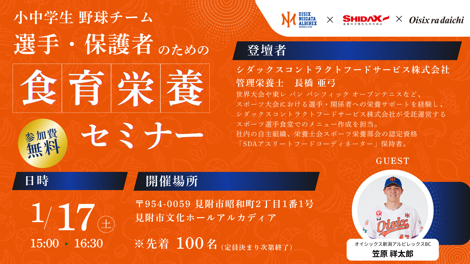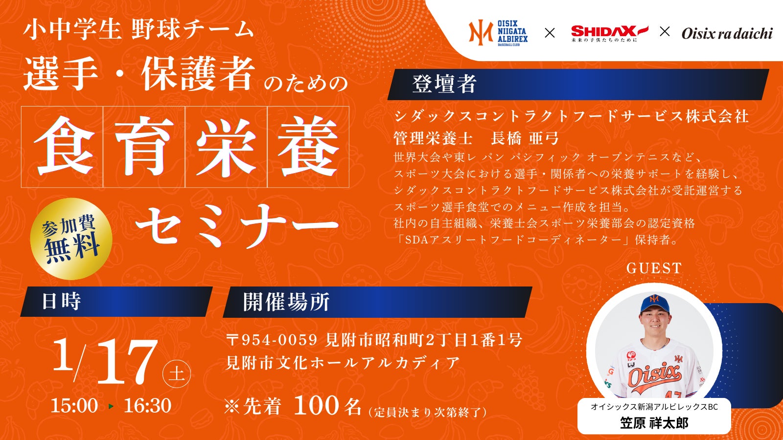 シダックスコントラクトフードサービス株式会社は、オイシックス新潟アルビレックスBCを共同運営している、オイシックス・ラ・大地株式会社のグループ会社です。今回、グループ会社の繋がりを活かし、シダックスコントラクトフードサービス株式会社の知識を新潟の保護者の皆様にお伝えし、望ましい食生活の実践につなげられることを目的に開催いたします。