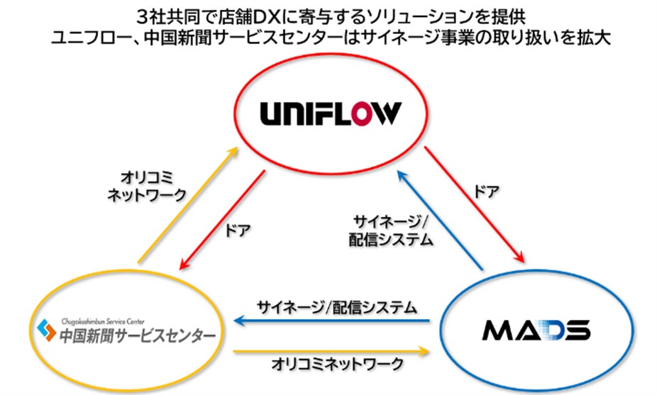 MADSは、2社のシステム開発・デジタルサイネージ連携部分を担うことで、中国新聞SC、ユニフローと共に流通業界のお客様の店頭販促メディアとして活用できるソリューションを拡大します。