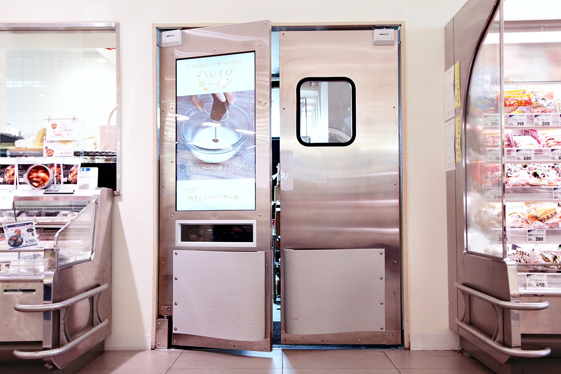 ユニフローは、スーパーマーケットをはじめとする流通業界のお客様を中心に、店舗空間の安全性と快適性を支える製品を提供しています。2023年からは新しい提案として、より店内と一体化したサイネージスイングドアを販売しています。
