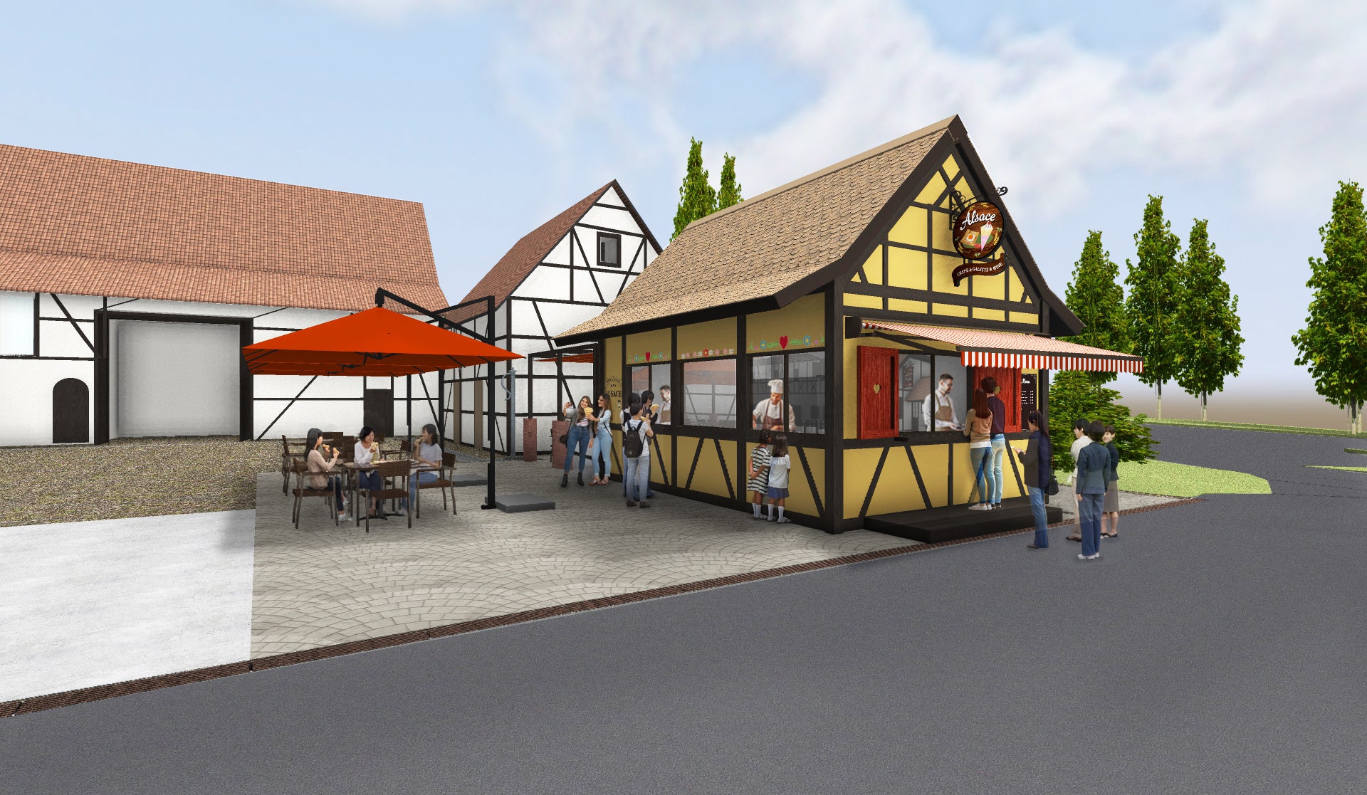 店舗の外観は隣接する展示家屋にもみられるフランス アルザス地方の伝統的な木造建築(コロンバージュ)を模し、展示家屋とともにアルザス地方の街並みの雰囲気を創出します。
