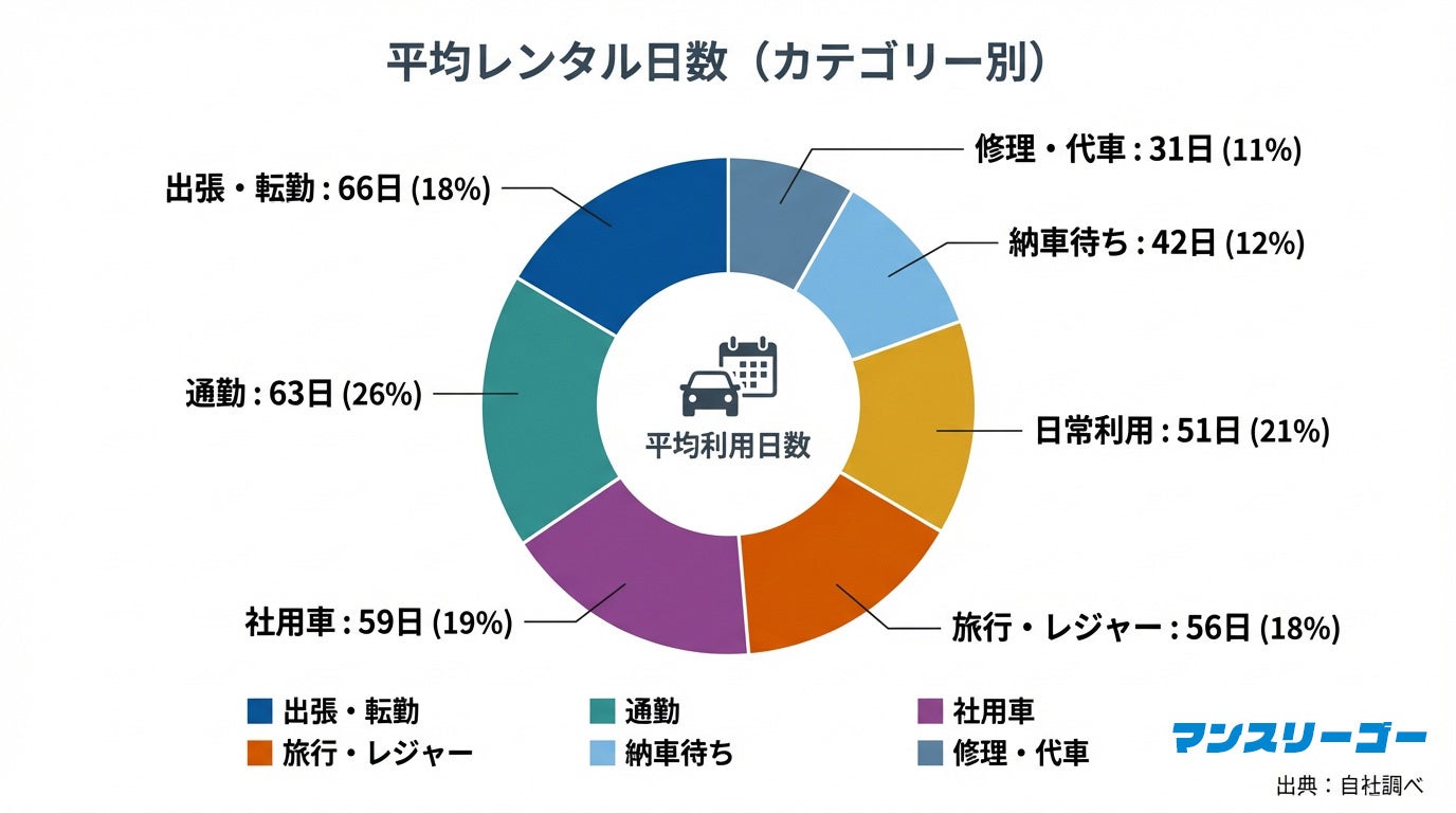 多くの利用が1〜2ヶ月以上に集中しており、1日・1週間単位の短期レンタカーでは現実的に対応できない実態が明らかになりました。