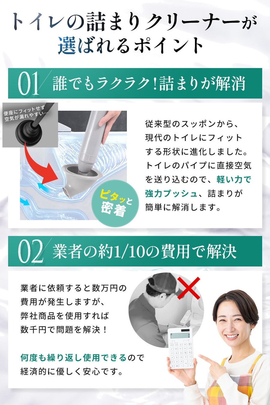 トイレ詰まりを業者に依頼すると数万円の費用が発生することも。本製品なら数千円で解決可能!さらに繰り返し使用できて経済的。
