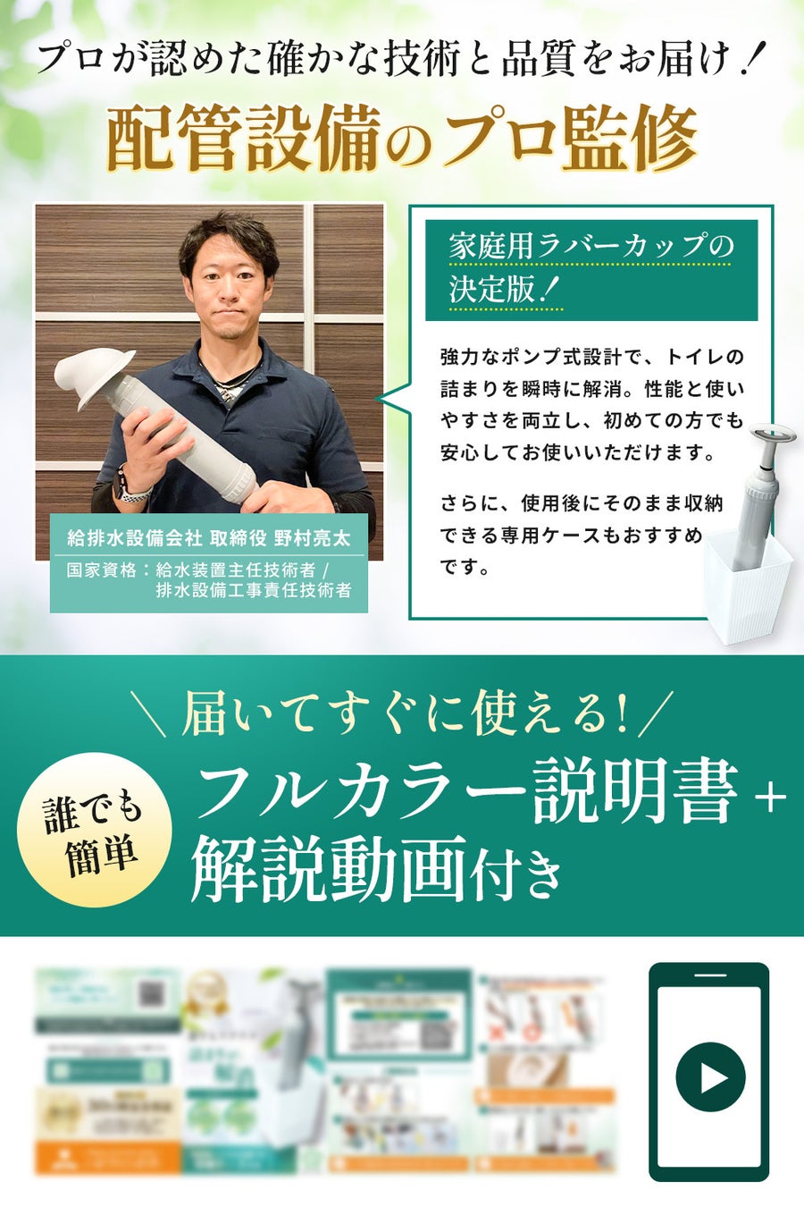 専門家の監修による商品開発により、確かな性能と誰でも使える説明書&解説動画付き!誰でも簡単にトイレの詰まりを解消できる家庭用ラバーカップの決定版です。