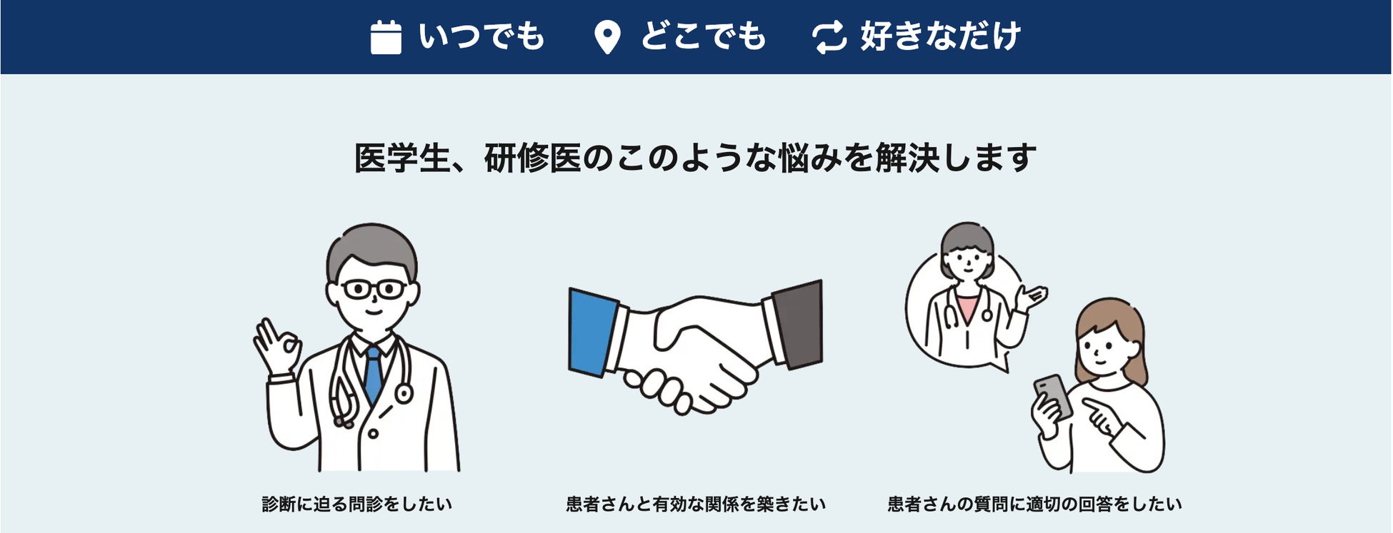 すべてのプランで、問診の回数に制限はありません。特に「Pro」プランでは、対応疾患数に制限がなく、苦手な疾患を何度でも繰り返し練習できるため、個人の学習ニーズに合わせたオーダーメイドの学習が可能です。