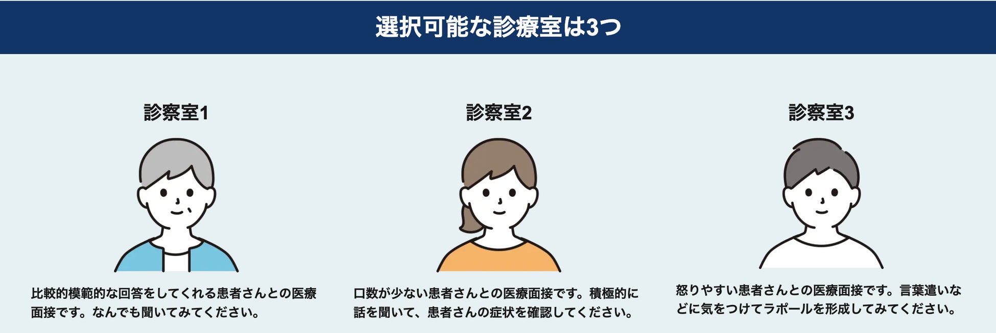 OPQRSTでは、1つの疾患に対して3タイプの「主訴(主な症状)」が用意されています。さらに、それぞれの主訴ごとに異なる性格の患者が「診察室1」「診察室2」「診察室3」に待機しており、1疾患あたり最大9パターンの問診シミュレーションが可能で、実践的なトレーニング環境を提供します。