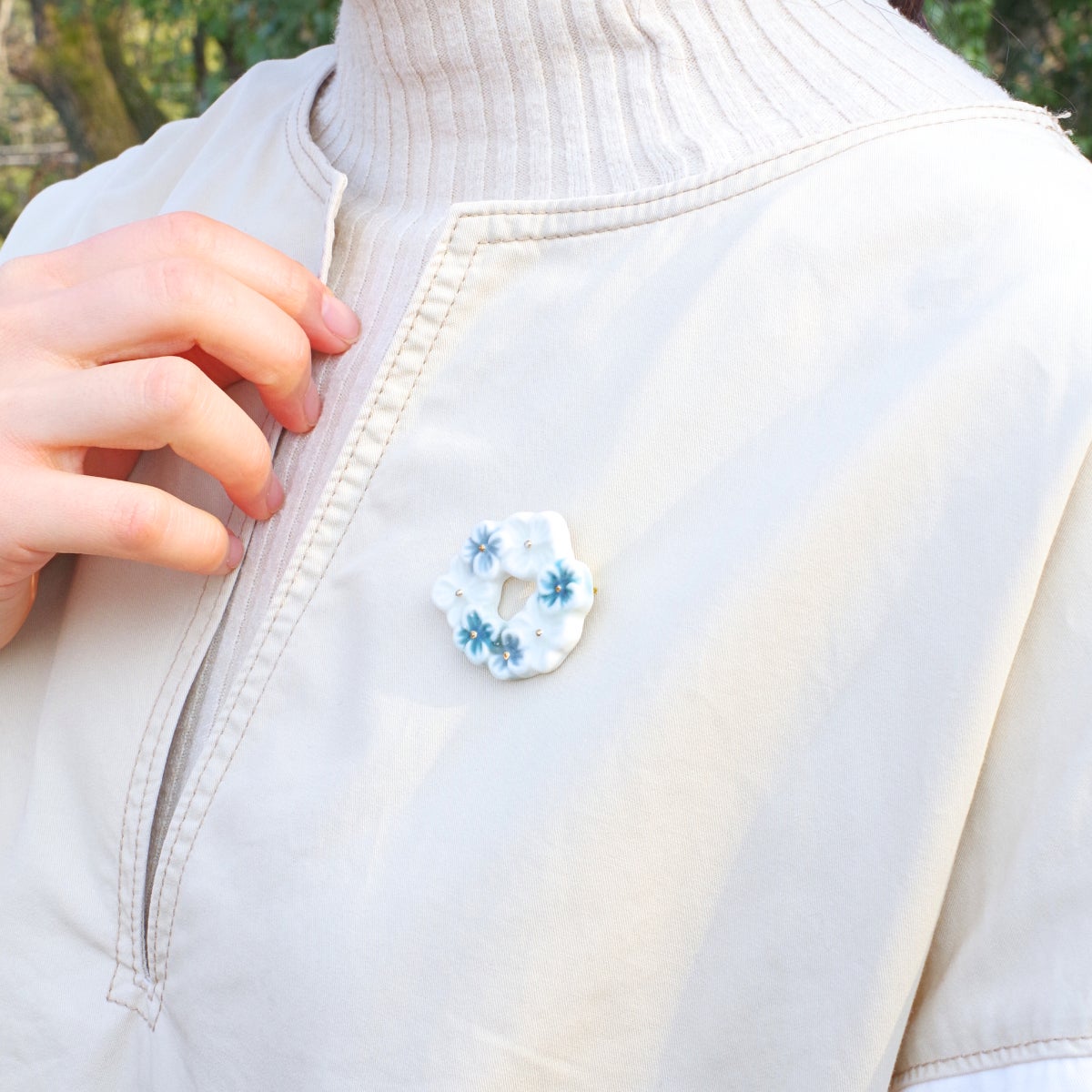 春の大地を水色に染める可憐な花、ネモフィラ。その花を1輪摘み取って、好きな人の胸元に飾る。そんなイメージでブローチにしました。控えめなサイズ感が、さりげない装いのポイントになるでしょう。